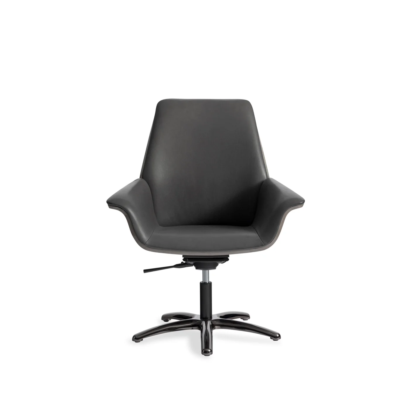 Opis: Fotel biurowy Bollington oddaje kwintesencję cech marki Bentley Home i świetnie odnajdzie się w przestrzeni nowoczesnego gabinetu. Oparcie wykonane z giętego drewna dostępne w wykończeniu ze skóry lub forniru, dla którego dostępne jest również opcjonalne lakierowanie Degrade. Tapicerka dostępna z kolekcji skór i tkanin. Podstawa aluminiowa wykończona w kolorze Gun-Metal Grey, została wyposażona w regulację wysokości siedziska.