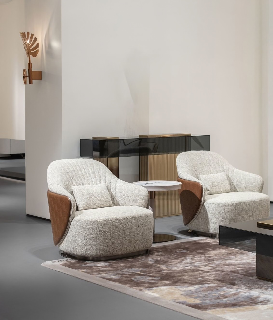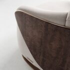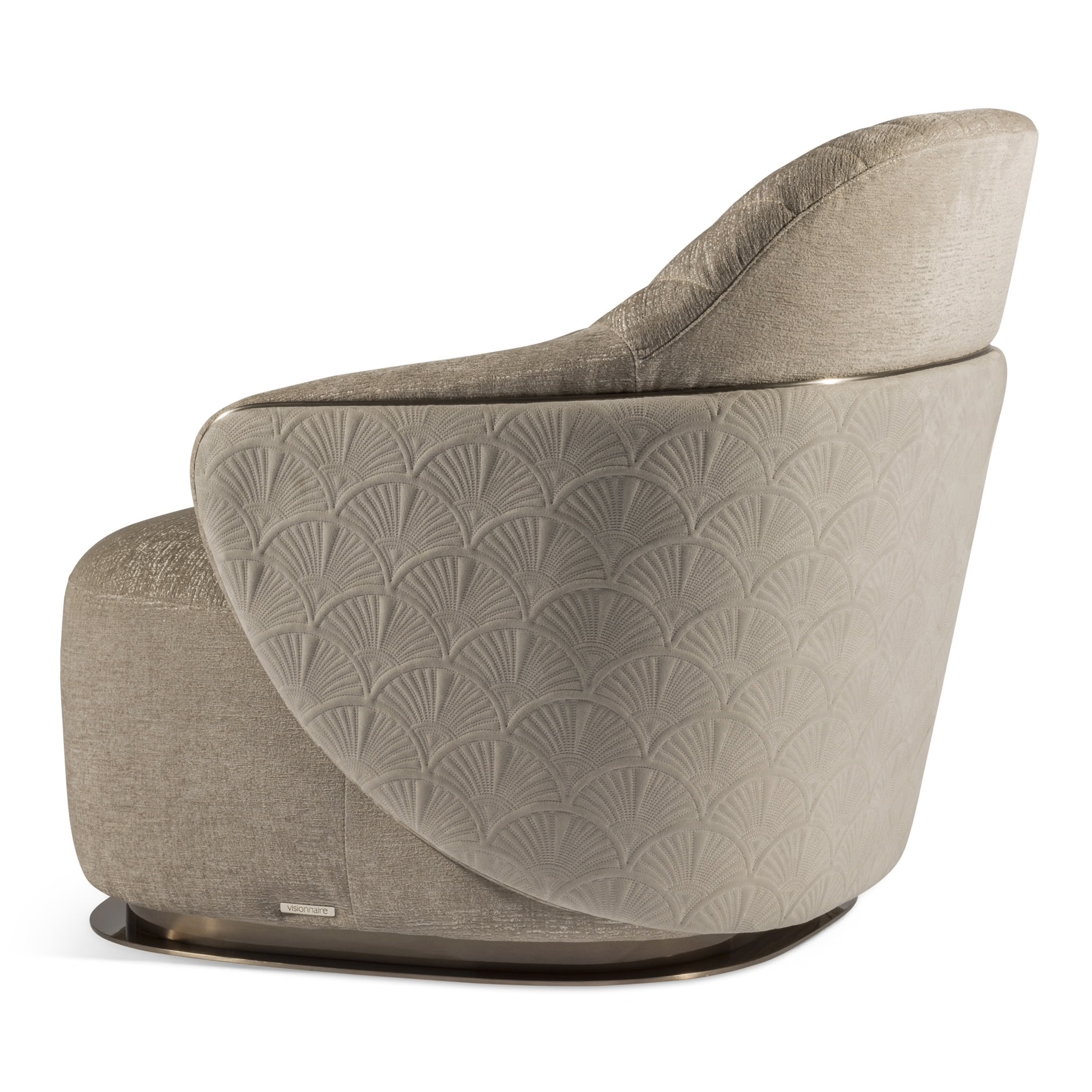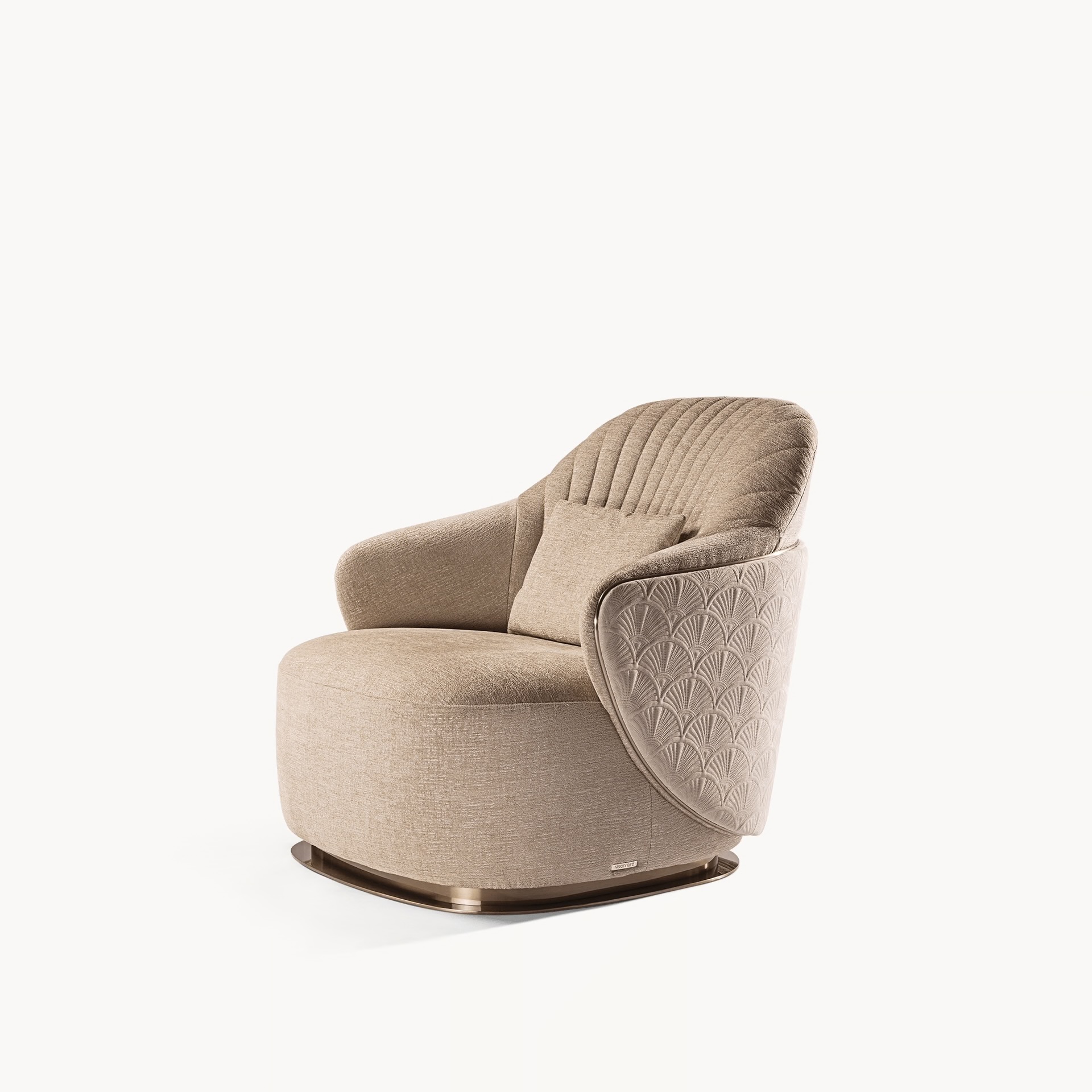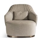 Opis: Adele to fotel o otulających liniach, tapicerowany skórą lub tkaniną, z pikowanymi detalami i haftem na całej powierzchni zewnętrznej oparcia. Zakrzywiona drewniana konstrukcja obejmuje obszerne siedzisko, oddzielone metalową lamówką. Podstawa ze stali nierdzewnej, dostępna w różnych metalicznych wykończeniach, dopełnia całość. Ten model dostępny jest również z oparciem z drewna sękatego o wysokim połysku, podkreślającym jego elegancję i zaokrąglony profil.