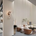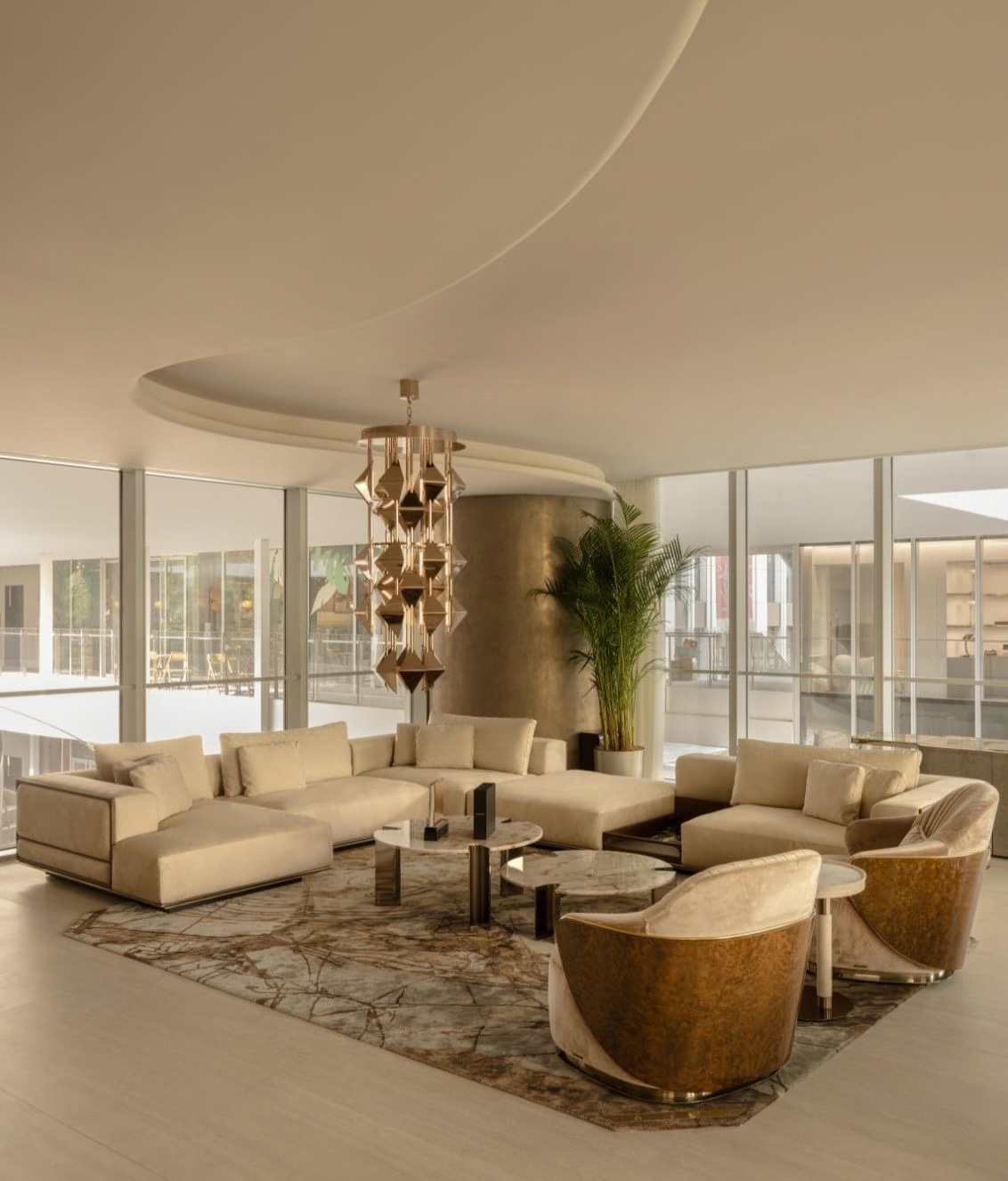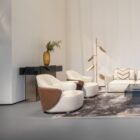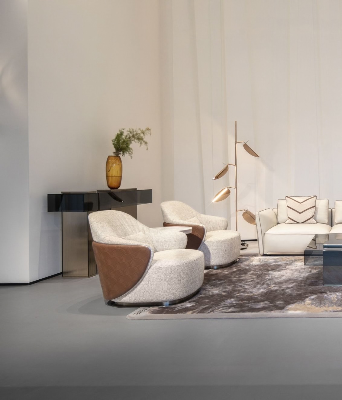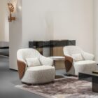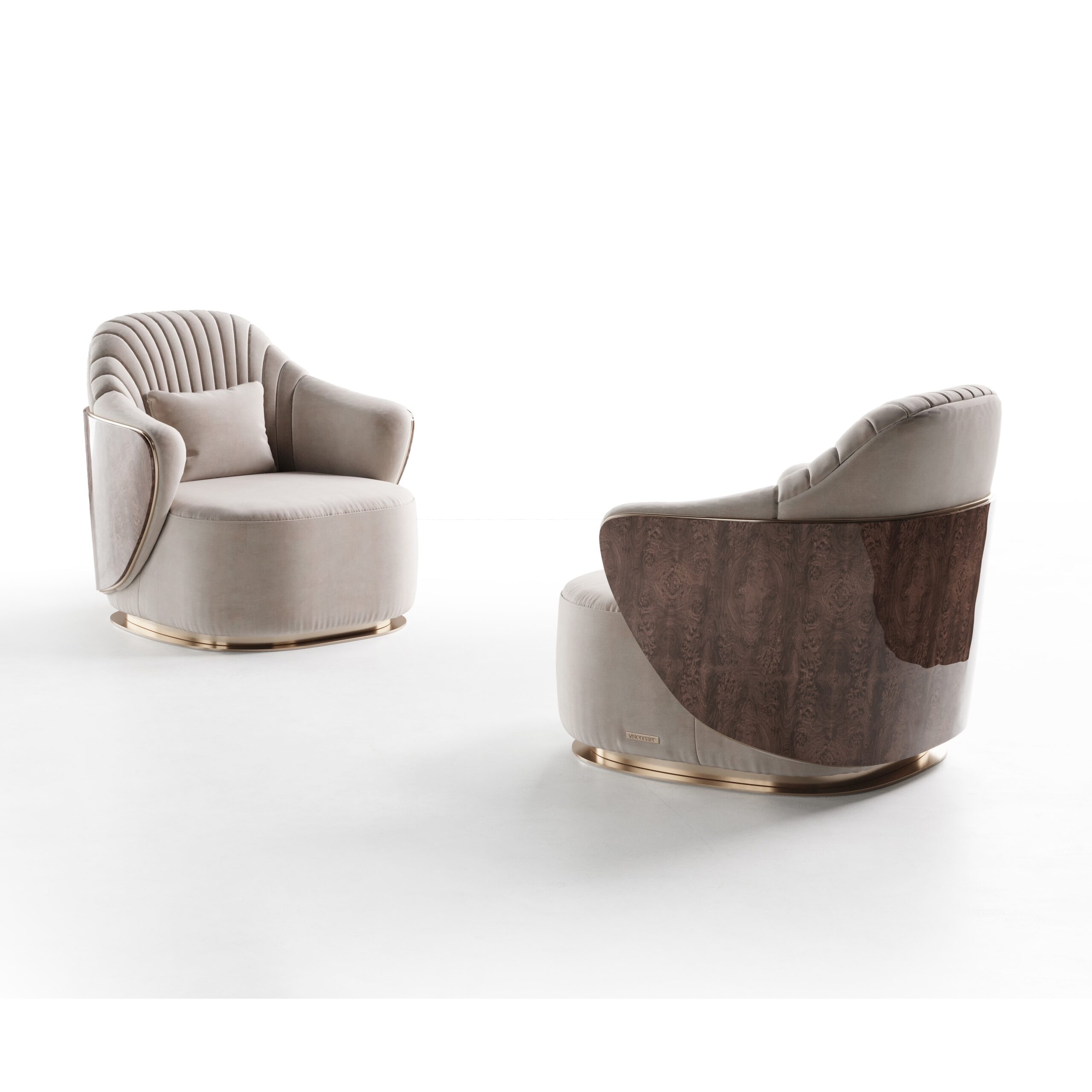 Opis: Adele to fotel o otulających liniach, tapicerowany skórą lub tkaniną, z pikowanymi detalami i haftem na całej powierzchni zewnętrznej oparcia. Zakrzywiona drewniana konstrukcja obejmuje obszerne siedzisko, oddzielone metalową lamówką. Podstawa ze stali nierdzewnej, dostępna w różnych metalicznych wykończeniach, dopełnia całość. Ten model dostępny jest również z oparciem z drewna sękatego o wysokim połysku, podkreślającym jego elegancję i zaokrąglony profil.