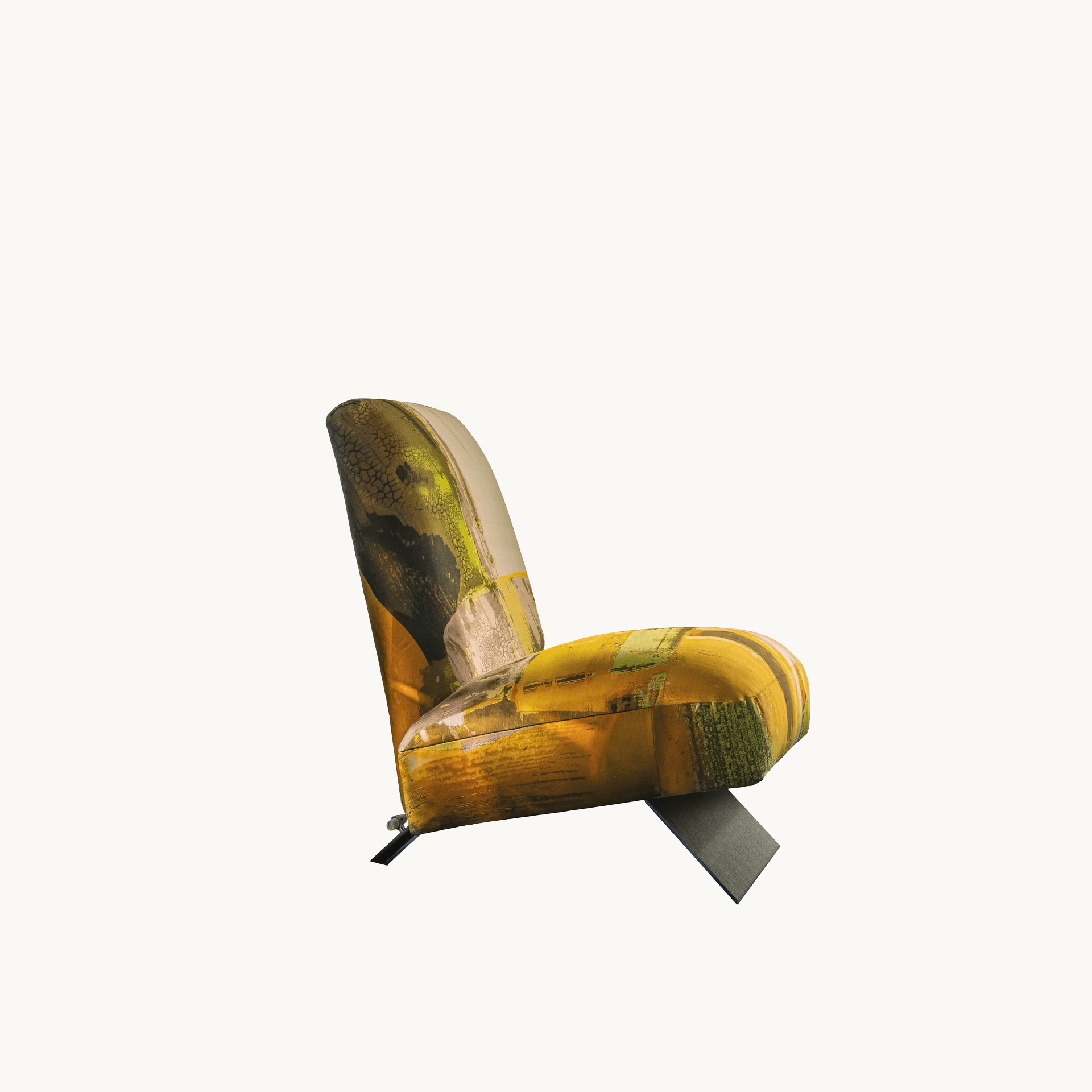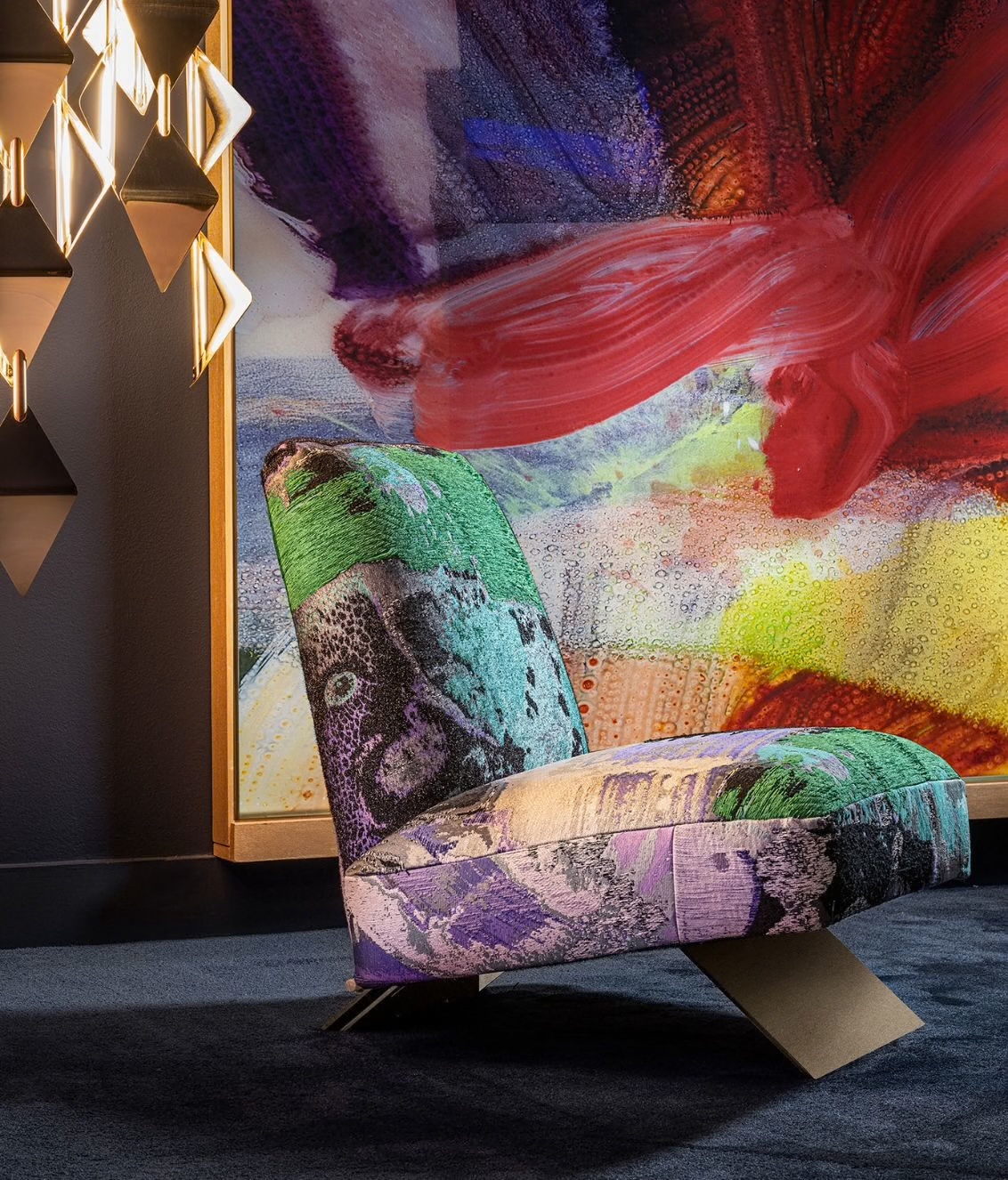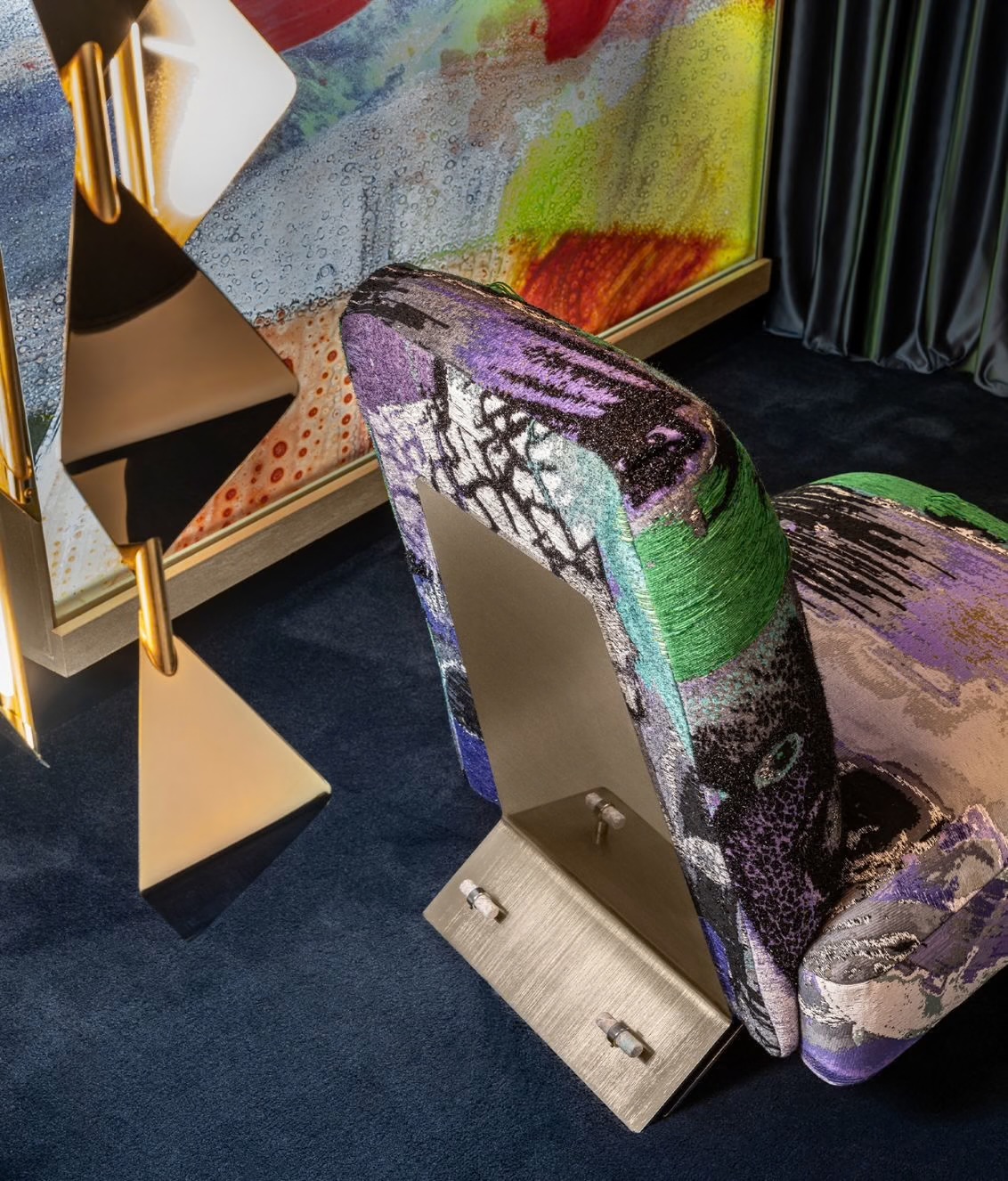 Opis: Aries Art to nowa, (limitowana 8 szt.) odsłona fotela Aries. Ten wypoczynkowy fotel z szerokim, ergonomicznie wyprofilowanym siedziskiem stał się obiektem sztuki dzięki zastosowaniu wyjątkowej tkaniny. Kompaktowa bryła spoczywa na podstawie z giętych blach, połączonych chromowanymi, mosiężnymi elementami toczonymi z marmurowymi wstawkami. Tym razem tapicerka nawiązuje do obrazów tworzonych przez artystyczny duet Draga & Aurel.