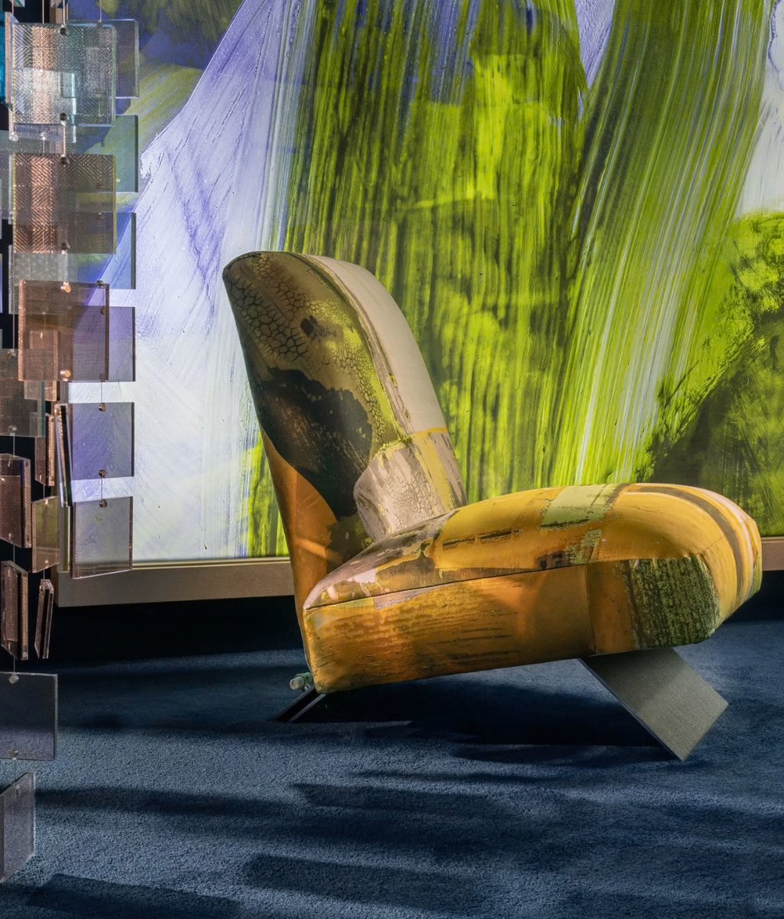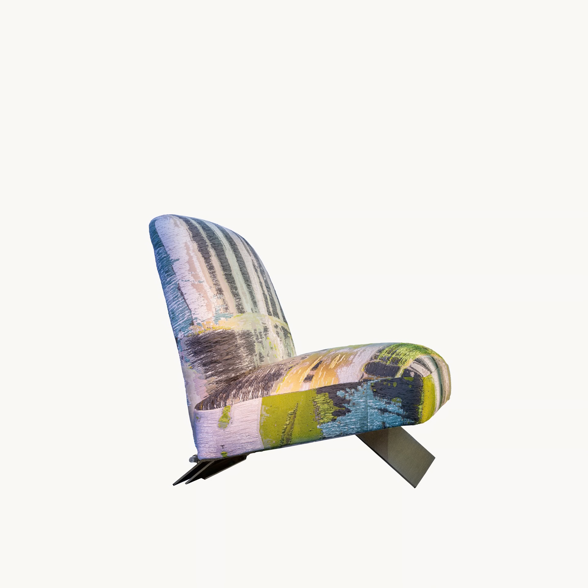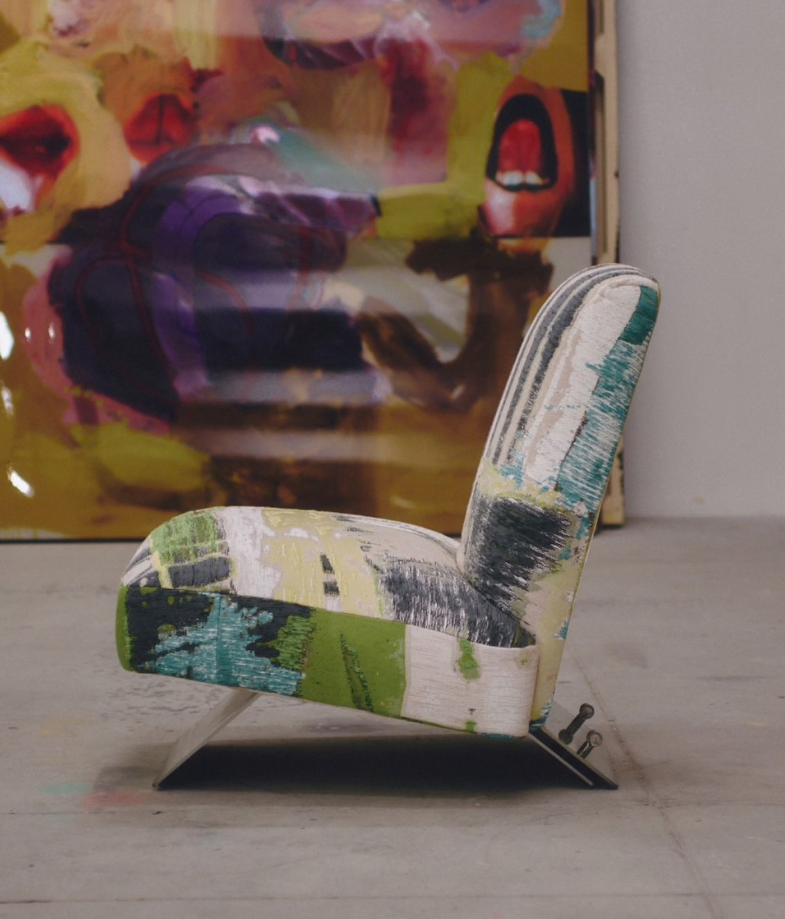 Opis: Aries Art to nowa, (limitowana 8 szt.) odsłona fotela Aries. Ten wypoczynkowy fotel z szerokim, ergonomicznie wyprofilowanym siedziskiem stał się obiektem sztuki dzięki zastosowaniu wyjątkowej tkaniny. Kompaktowa bryła spoczywa na podstawie z giętych blach, połączonych chromowanymi, mosiężnymi elementami toczonymi z marmurowymi wstawkami. Tym razem tapicerka nawiązuje do obrazów tworzonych przez artystyczny duet Draga & Aurel.