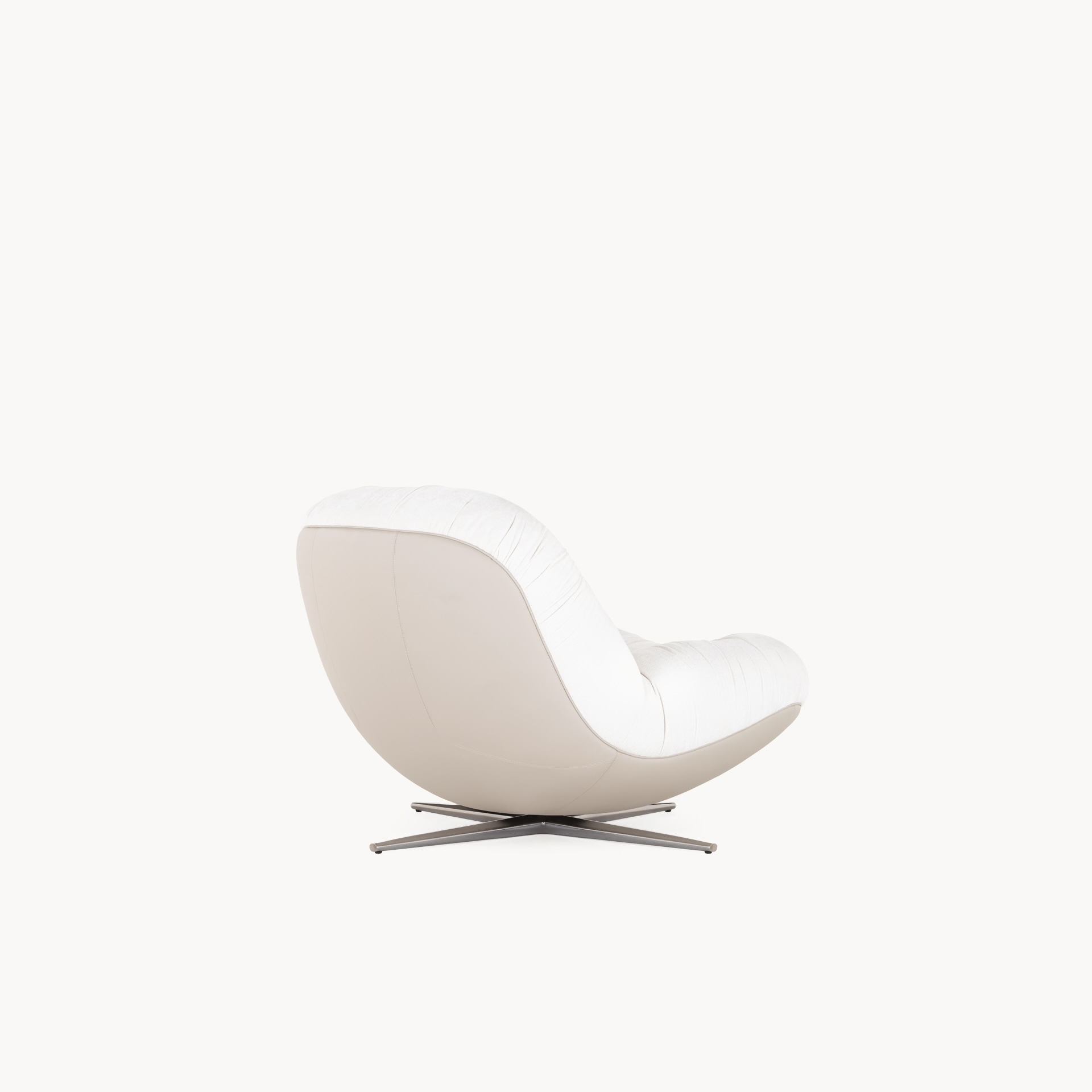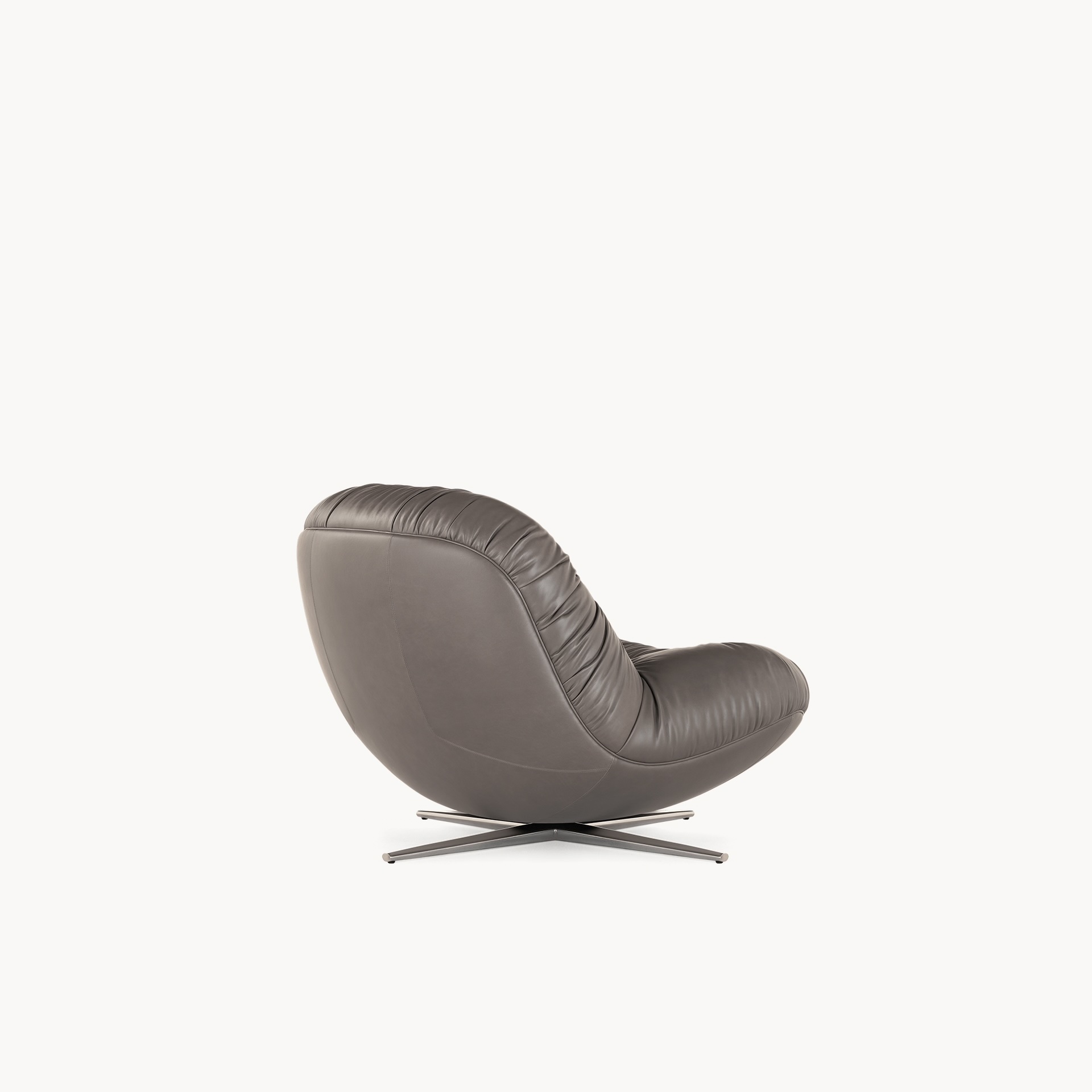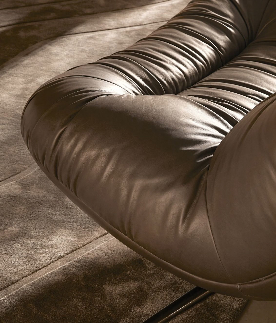 Opis: Fotel Aura ma oryginalną podstawę w kształcie półkuli, modelowaną jako ciągła powierzchnia łącząca siedzisko, oparcie i podłokietniki. Wyściółka z poliuretanu i pianki memory zapewnia głęboki komfort podzielony na cztery strefy. Dostępny z tapicerką skórzaną lub materiałową oraz obrotową podstawą ze stali nierdzewnej, w szerokiej gamie polerowanych lub satynowych wykończeń metalowych.