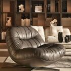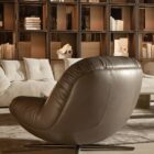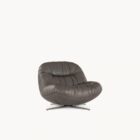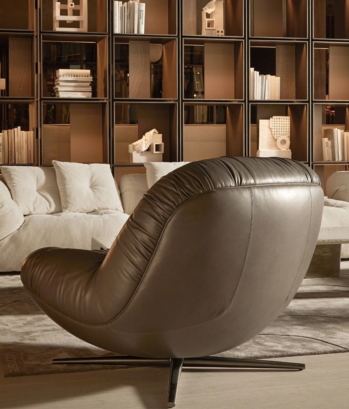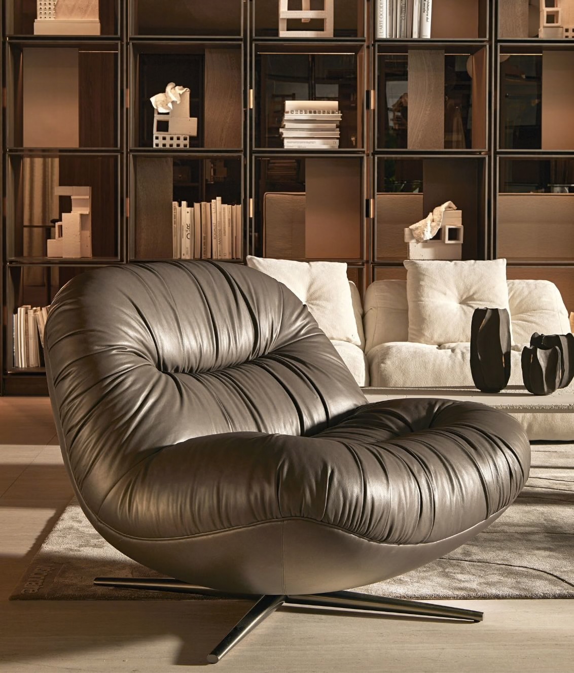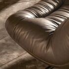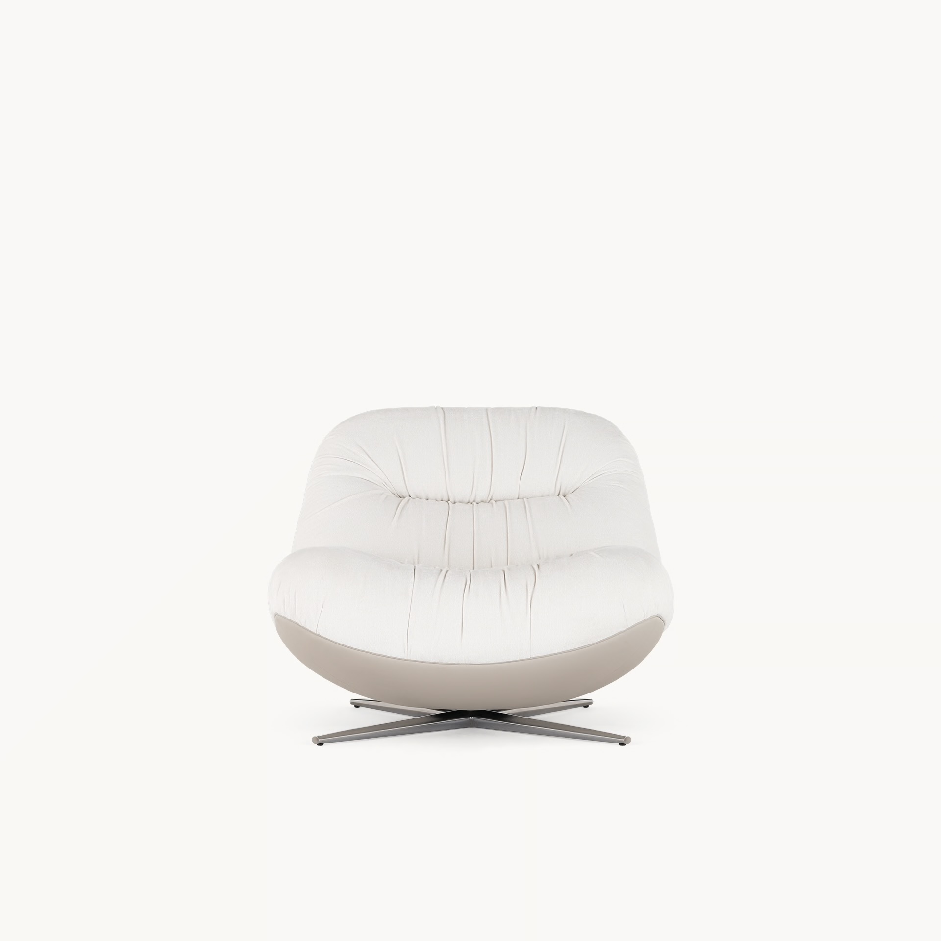 Opis: Fotel Aura ma oryginalną podstawę w kształcie półkuli, modelowaną jako ciągła powierzchnia łącząca siedzisko, oparcie i podłokietniki. Wyściółka z poliuretanu i pianki memory zapewnia głęboki komfort podzielony na cztery strefy. Dostępny z tapicerką skórzaną lub materiałową oraz obrotową podstawą ze stali nierdzewnej, w szerokiej gamie polerowanych lub satynowych wykończeń metalowych.