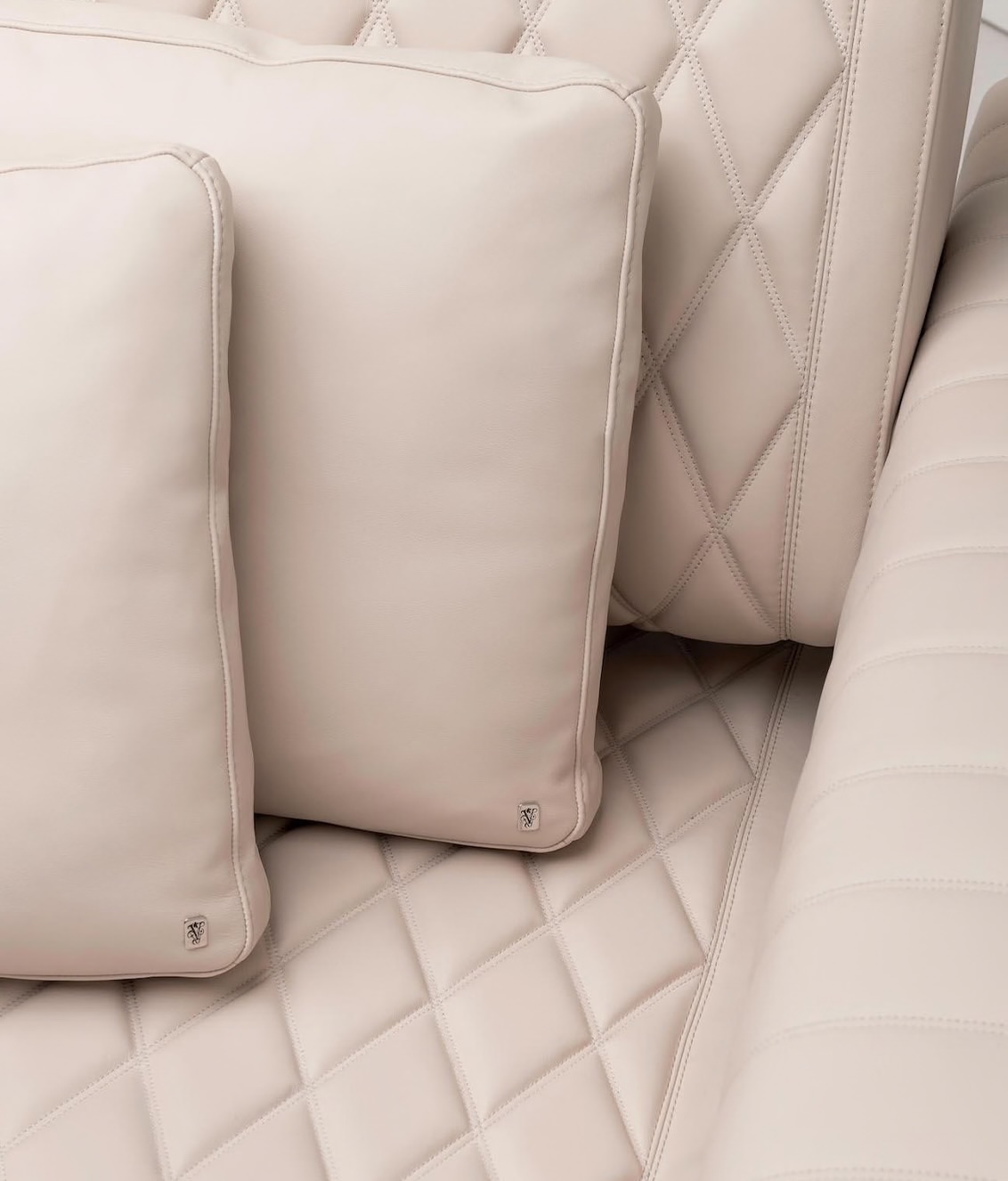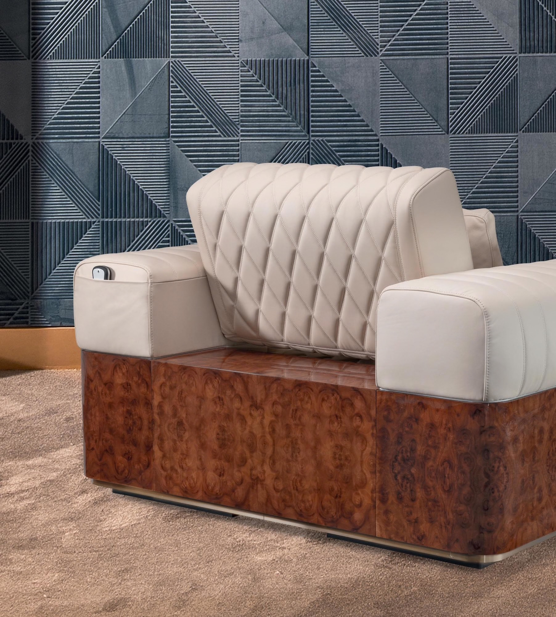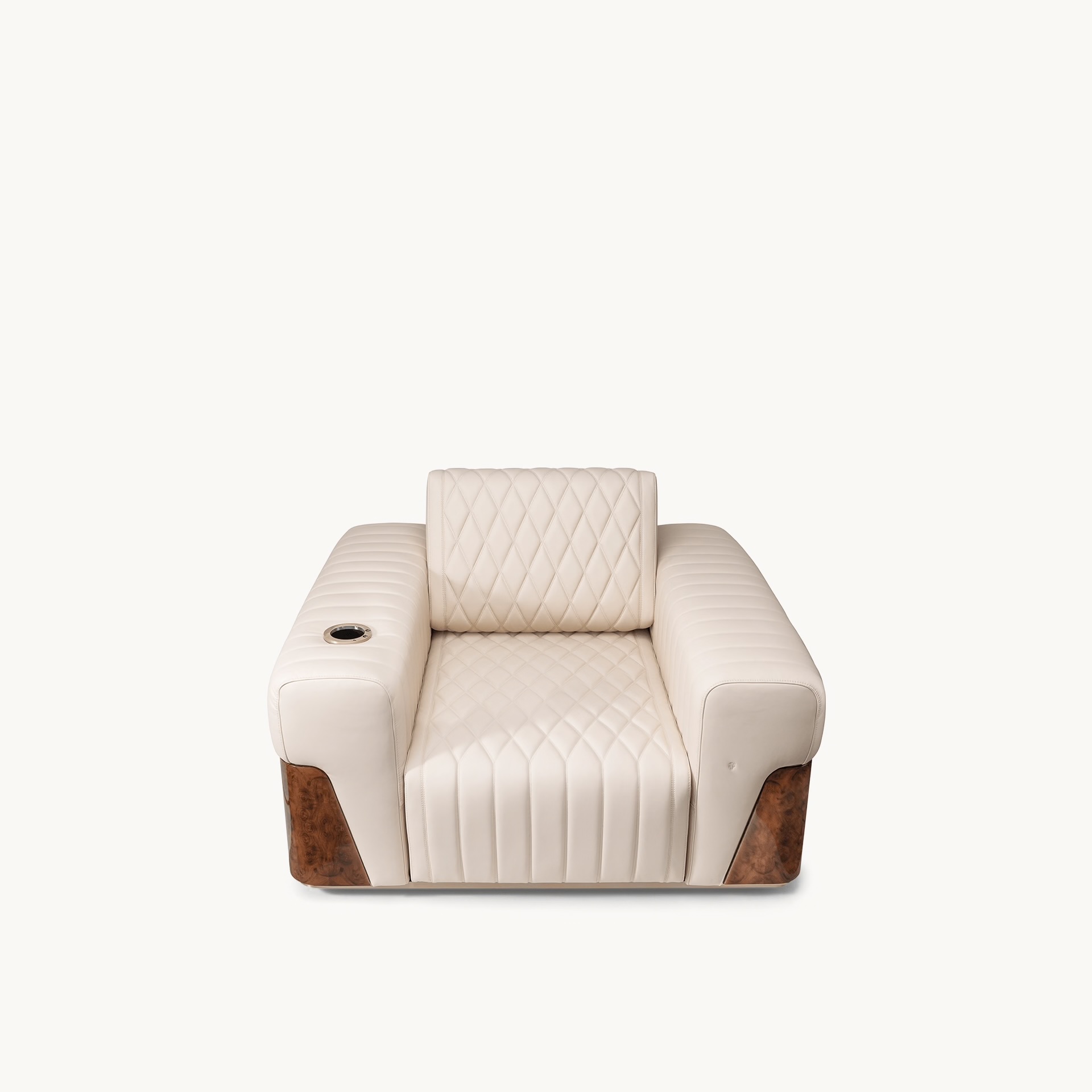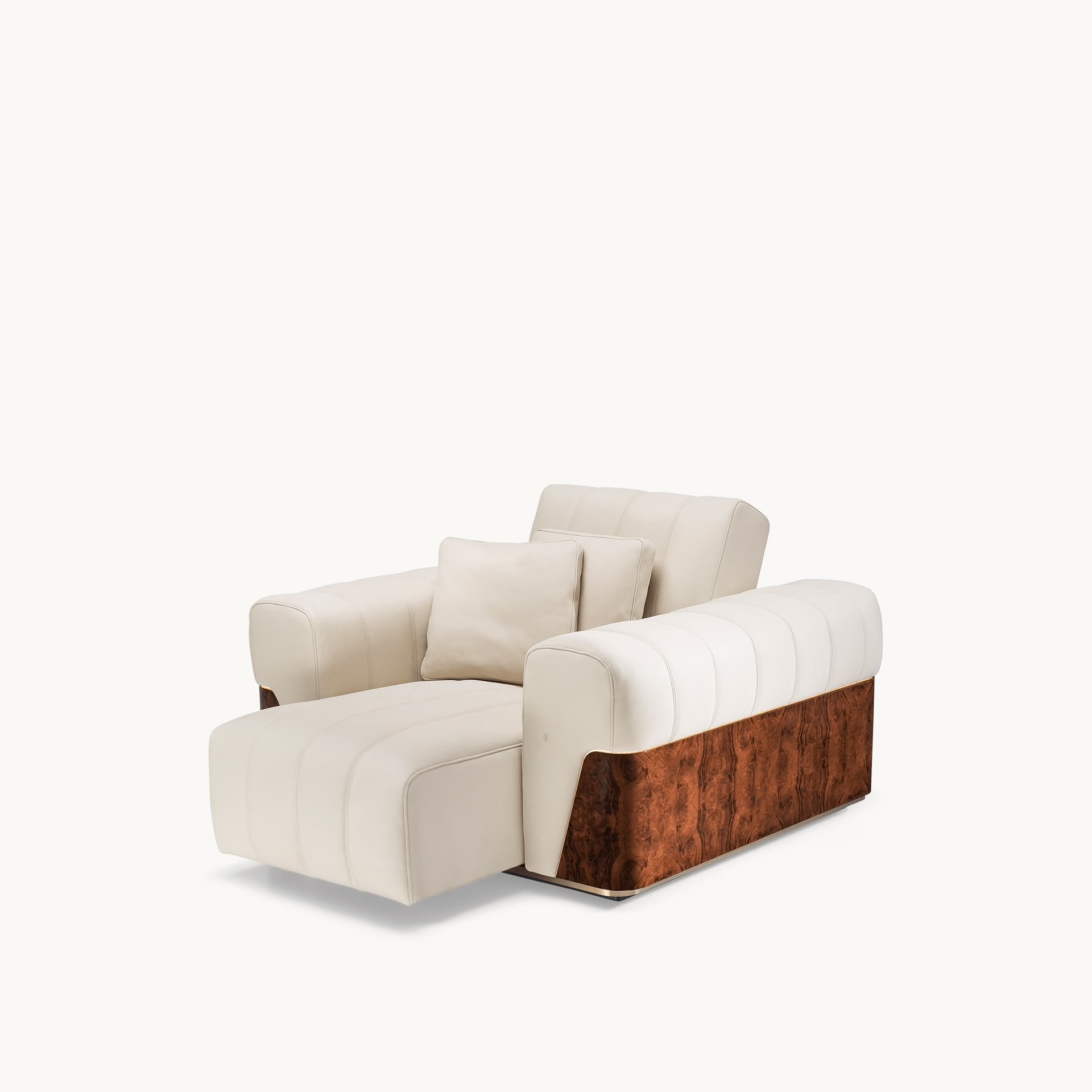 Opis: Brubeck to fotel tapicerowany skórą lub tkaniną, z wysuwanym siedziskiem i elektrycznie regulowanym oparciem. Zewnętrzna część oparcia z giętego drewna – dostępnego w połysku, fornirze lub lakierze – tworzy architektoniczną bryłę, która otacza piankę Memory Foam® i wypełnienie z pierza, wykończone pikowaniem w paski lub romby. Podstawa ze stali nierdzewnej dopełnia projekt wyrafinowanym, technicznym akcentem. Zasilany z sieci elektrycznej.