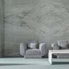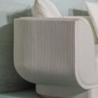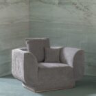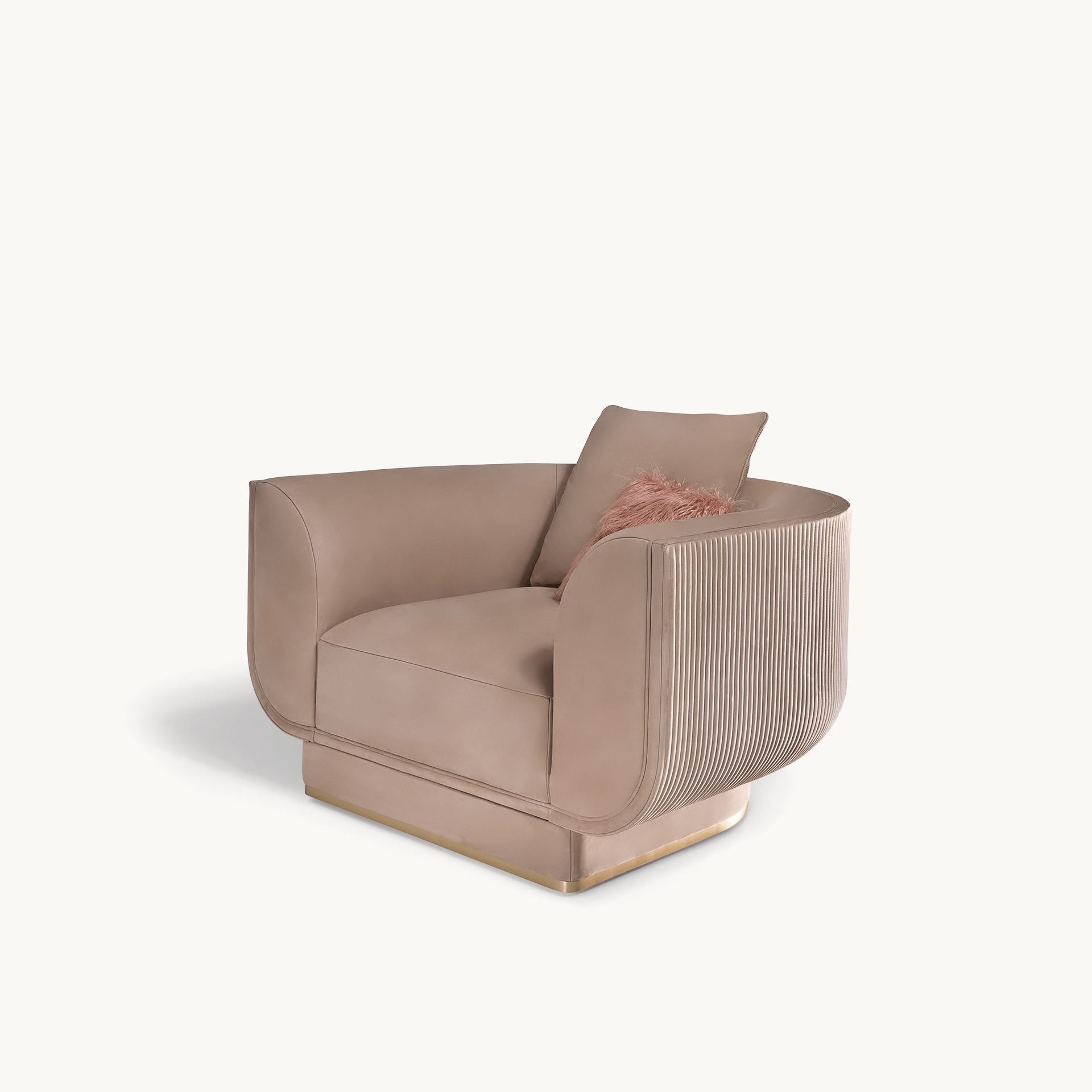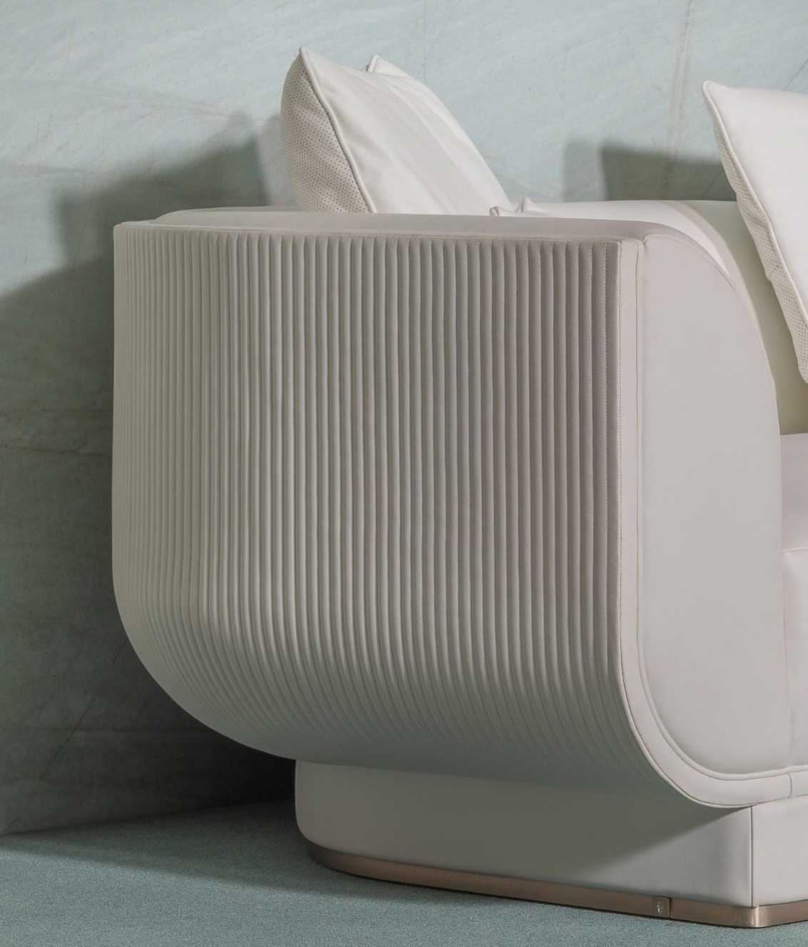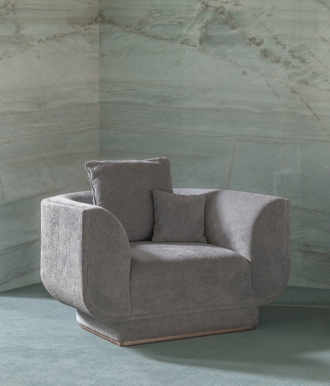 Opis: Foster to fotel tapicerowany skórą lub tkaniną, którego kształt podkreślają płynne, zaokrąglone kształty. Siedzisko jest podparte na elastycznej taśmie, a wypełnienie z poliuretanu o różnej gęstości zapewnia długotrwały komfort. Poduszka oparcia wypełniona jest pierzem co zapewnia doskonały komfort, a zewnętrzna strona ramy wykończona jest pionowymi przeszyciami canneté. Obrotowa podstawa spoczywa na cokole ze stali nierdzewnej.