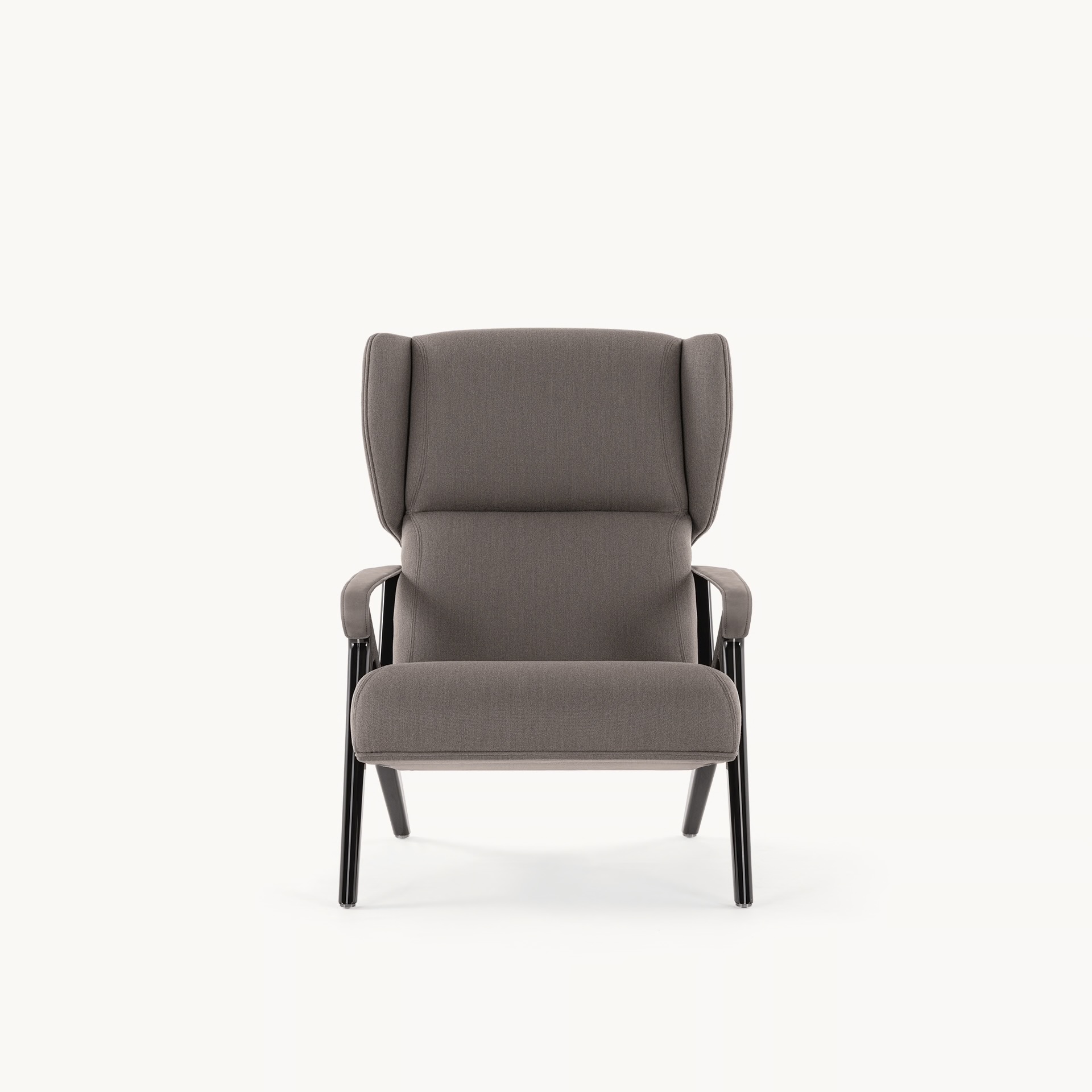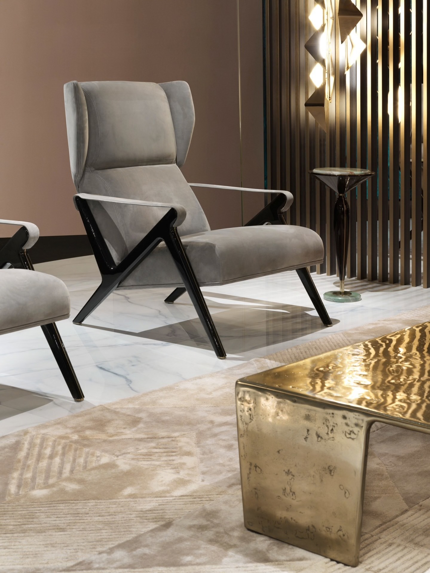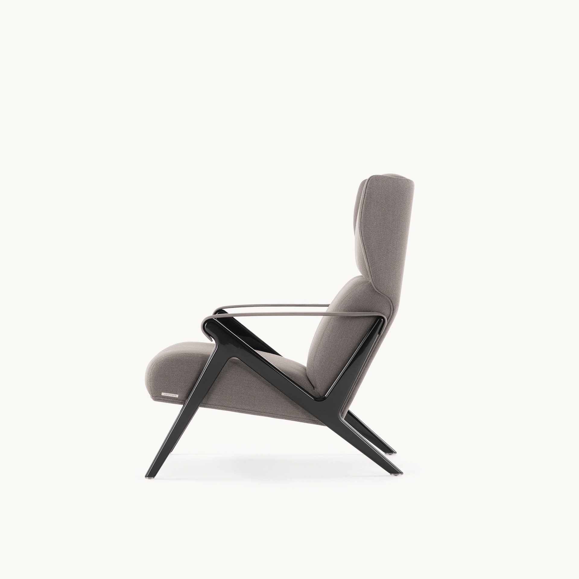 Opis: Imagine to tapicerowany skórą lub tkanina fotel z klejonego drewna, z elastycznym zawieszeniem, wyściełany poliuretanem o różnych gęstościach dla maksymalnego komfortu. Podłokietniki wykonane z metalowych elementów pokrytych skórą elegancko komponują się z połyskującymi, czarnymi, lakierowanymi, drewnianymi nogami, ozdobionymi charakterystyczną lamówką. Metalowe nóżki, dostępne w różnych wykończeniach dopełniają wyrafinowany design fotela.