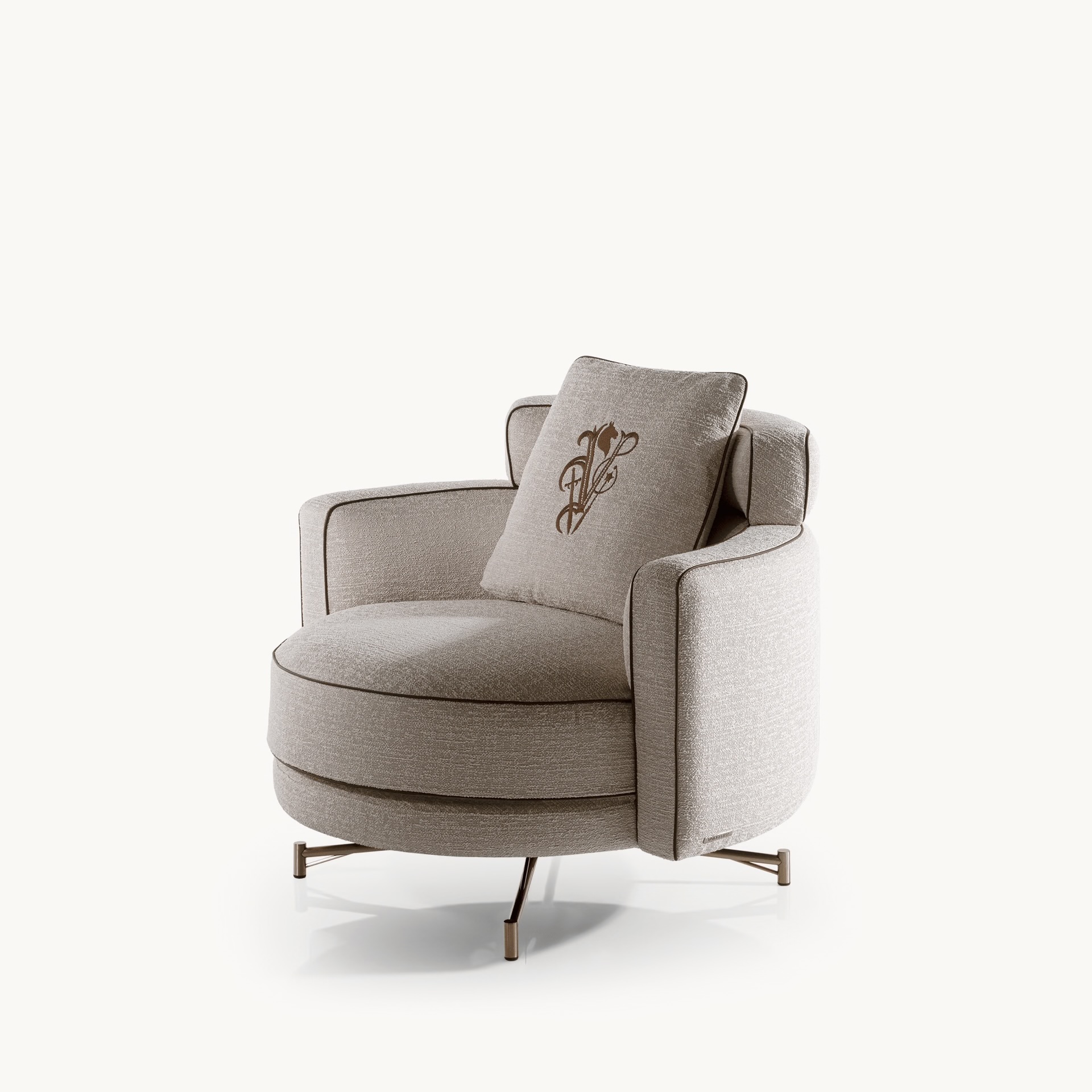 Opis: Khamma to elegancki fotel, tapicerowany skórą lub tkaniną, z solidną drewnianą konstrukcją. Elastyczne taśmy zamontowane do stelaża oraz wygięte podłokietniki i oparcie zapewniają optymalny komfort. Wyściółka z poliuretanu o różnej gęstości i włókna akrylowego uzupełniona jest puchową poduszką oparcia. Kontrastujące detale, takie jak skórzane lamówki i haftowane logo Visionnaire, wzbogacają jego design. Podstawa ze stali nierdzewnej, dostępna w satynowym wykończeniu metalicznym, wyposażona jest w samonastawny system obrotowy z centralnym mocowaniem.