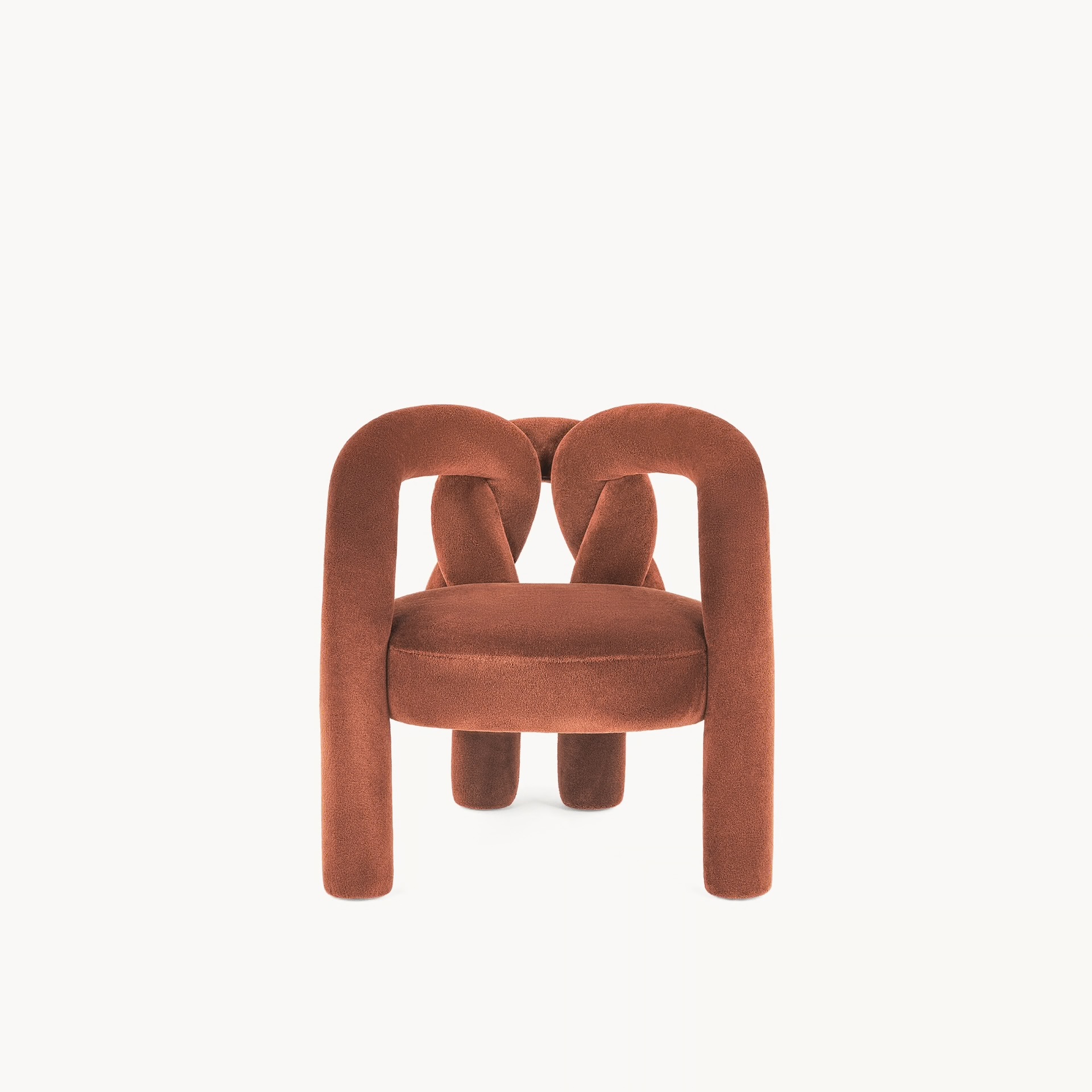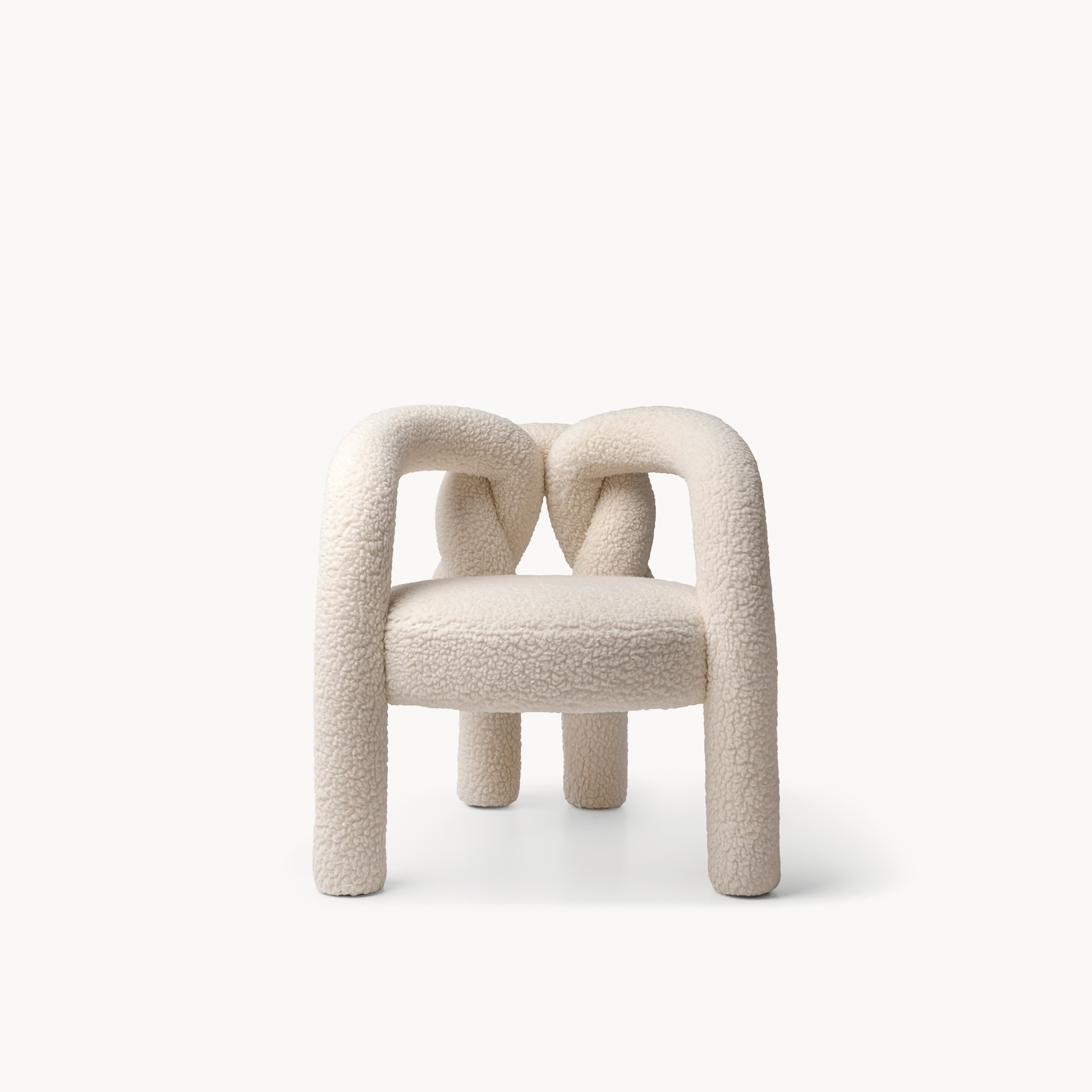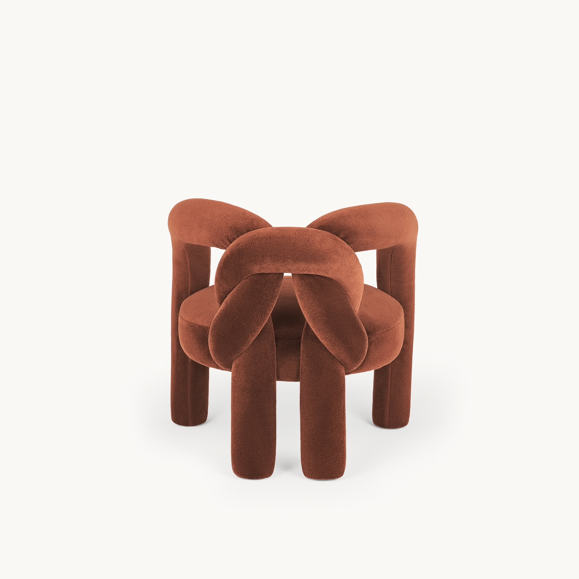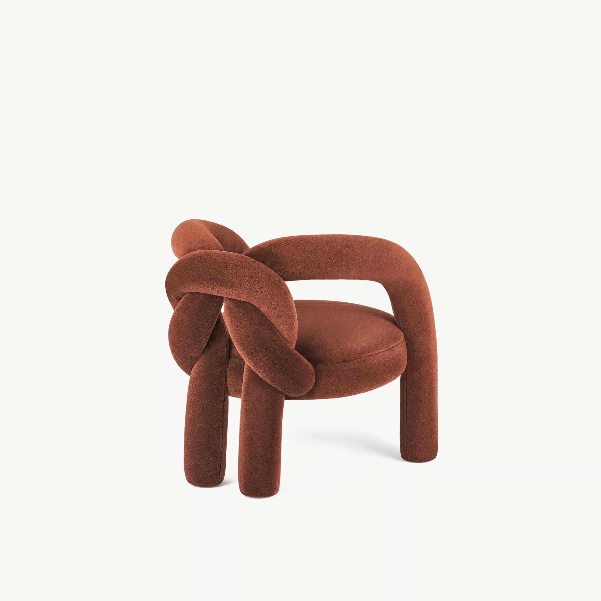 Opis: Shibari to mały fotel tapicerowany elastyczną tkaniną, z zakrzywioną metalową ramą o walcowatym kształcie, w pełni wyściełaną pianką poliuretanową o wysokiej gęstości. Przednie i tylne nogi łączą się z oparciem, tworząc przeplatający się element konstrukcyjny. Siedzisko, wsparte na elastycznej taśmie i wyściełane poliuretanem czyni go miękkim i wygodnym.