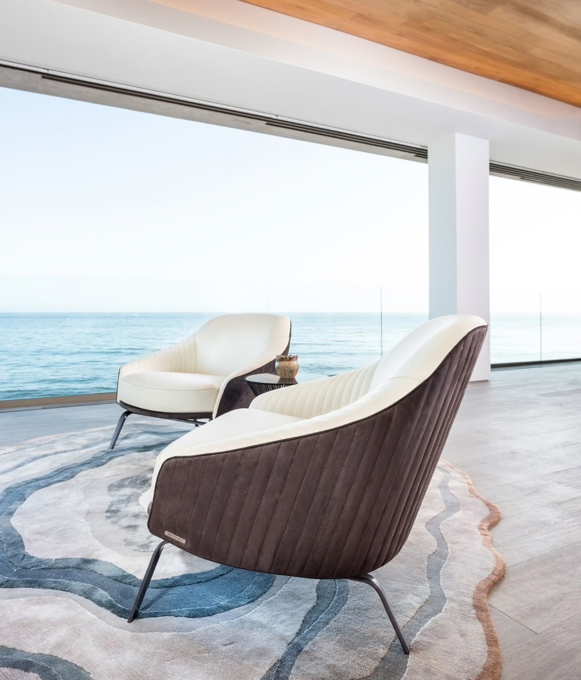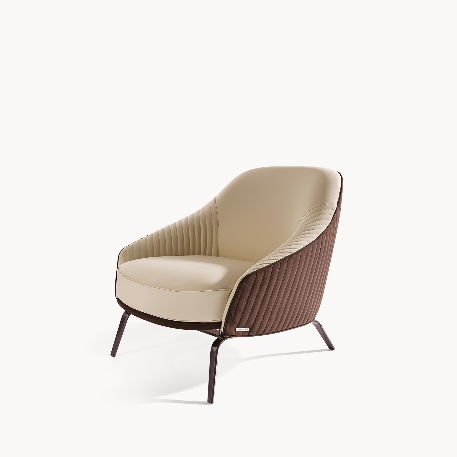 Opis: Whitney to fotel z zaokrągloną ramą z litego drewna. Elastyczne zawieszenie z taśmy i wyściółka z pianki poliuretanowej o różnej gęstości z dodatkiem włókna akrylowego zapewniają komfort podczas siedzenia. Wewnętrzna tapicerka posiada pionowe przeszycia, a zewnętrzna powłoka jest pokryta skórą lub tkaniną z haftem canneté. Siedzisko i oparcie są wykończone kontrastującą skórą lub tkaniną. Podstawa wykonana ze stali nierdzewnej jest dostępna w różnych metalicznych wykończeniach.