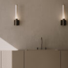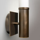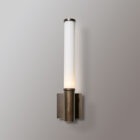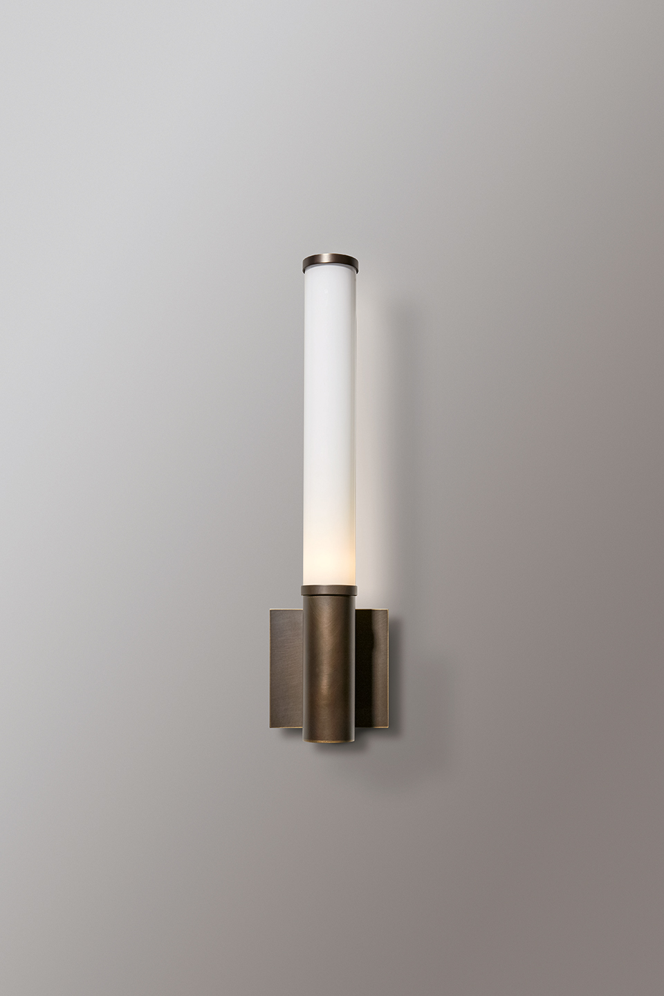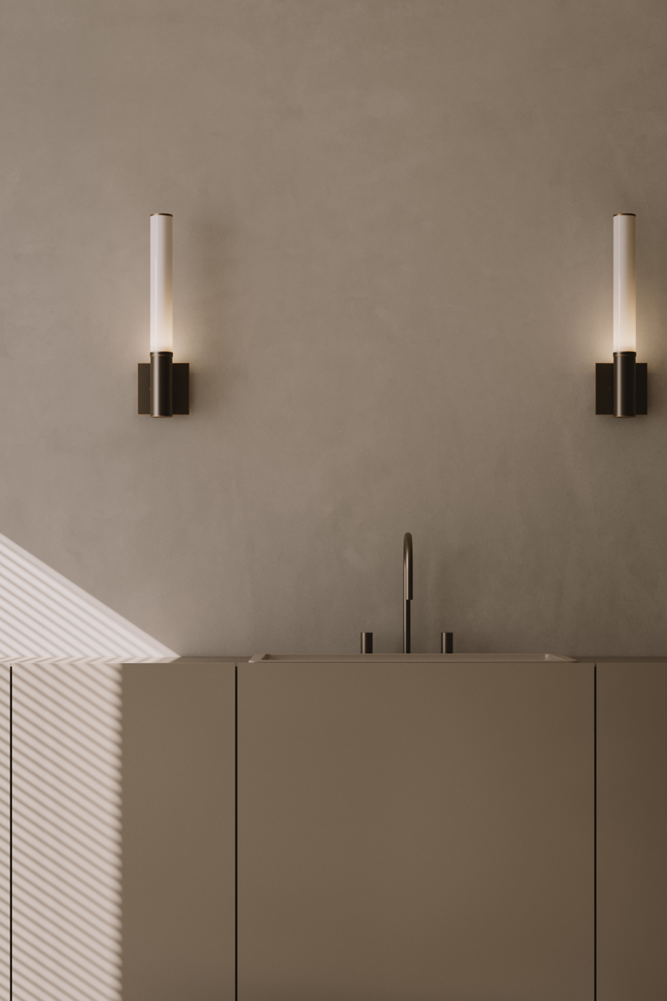 Opis: Cylindryczna forma stanowi element konstrukcyjny, wokół którego rozwija się materialna eksploracja światła. Kinkiet Root wyróżnia się białym, rurowym dyfuzorem ze szkła Murano, który definiuje świetlistą tożsamość projektu. Liniowa konstrukcja z ciemnego, polerowanego mosiądzu podtrzymuje bryłę, wzmacniając ciepłe, otulające światło, które emanuje w przestrzeni. Model Root jest również dostępny w wersji wiszącej.