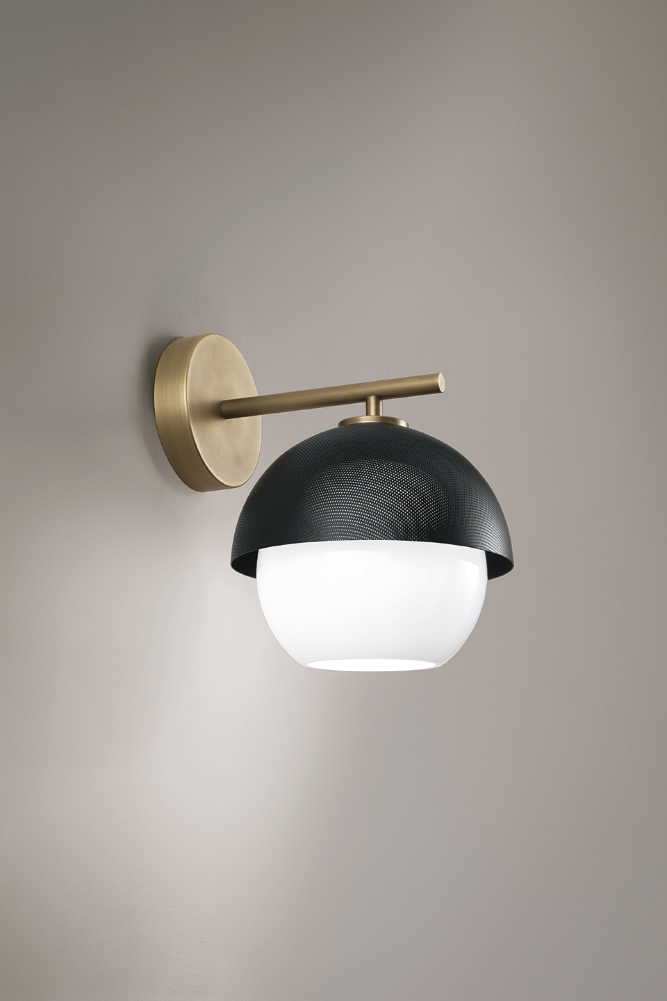 Opis: Surowe profile kinkietu są podkreślone światłem, które filtrując się przez mikrootwory, tworzy spokojną atmosferę. Jasny, polerowany rdzeń kinkietu z mosiądzu znajduje się w matowym, czarnym lub złotym, metalowym kloszu z perforacją, przez, które sączy się przyjemne światło. Model Urban jest również dostępny w wersji wiszącej.