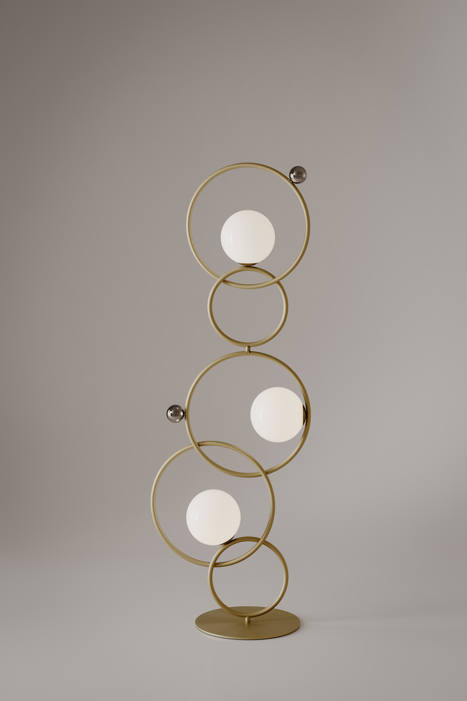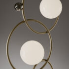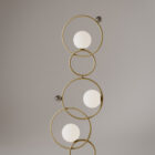 Opis: Lampa podłogowa Zoe eksploruje archetyp koła poprzez dynamikę i kompozycyjną równowagę kształtów. Pięć pierścieni, dostępnych w kolorze złota, czarnego niklu, polerowanego chromu lub jasnego, polerowanego mosiądzu, przecina się, odbijając i wzmacniając światło. Trzy okrągłe klosze z dmuchanego szkła Murano kontrastują z kulami z czarnego niklu, złota lub polerowanego chromu. Dostępna również w wersji stołowej.