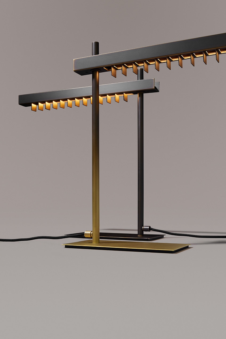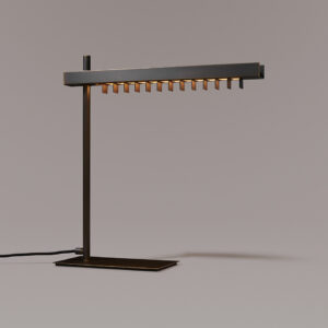 Opis: Geometryczny i współczesny design lampy Block to system oświetleniowy, który daje szerokie możliwości zastosowania. Dostępny jest w różnych formatach: wiszący, ścienny, podłogowy i stołowy. Pionowe, metalowe elementy o różnej wysokości z galwanicznym wykończeniem w kolorze brązu w których zamontowano światła LED, całość została osadzona w podstawia z czarnego marmuru Marquina. Matowe satynowe wykończenie marmuru w połączeniu z blaskiem metalu nadaje tej nowoczesnej lampie luksusowego i wyrafinowanego charakteru.