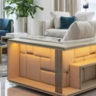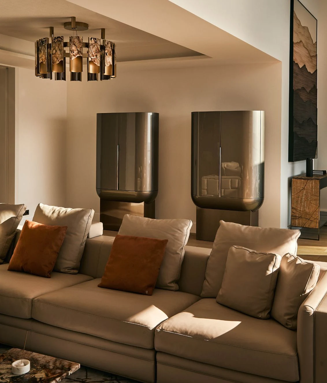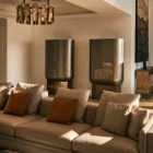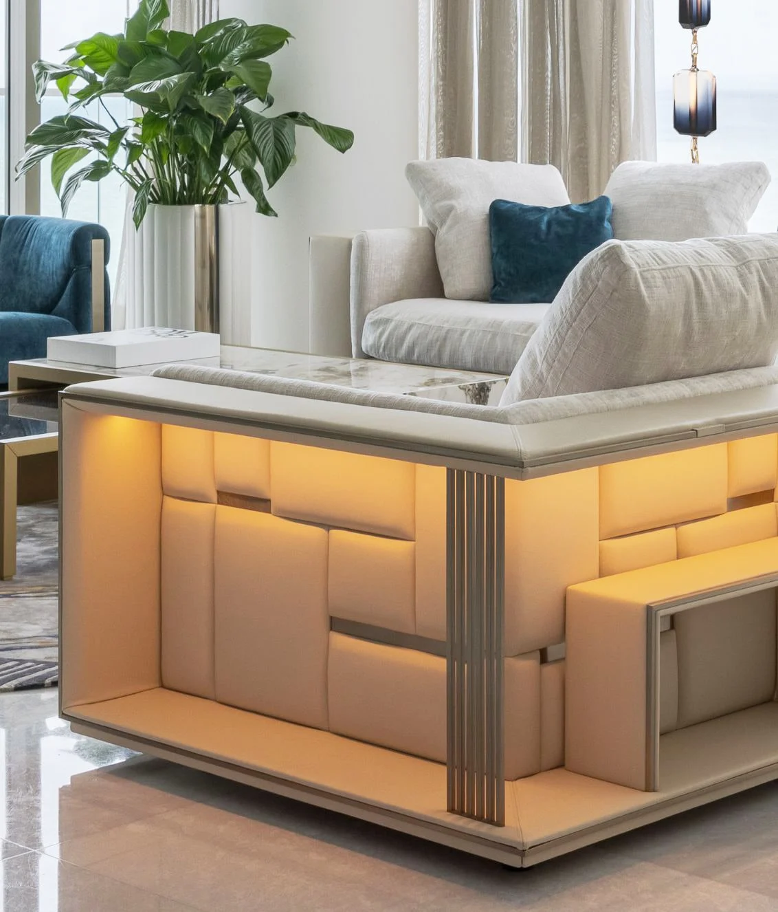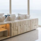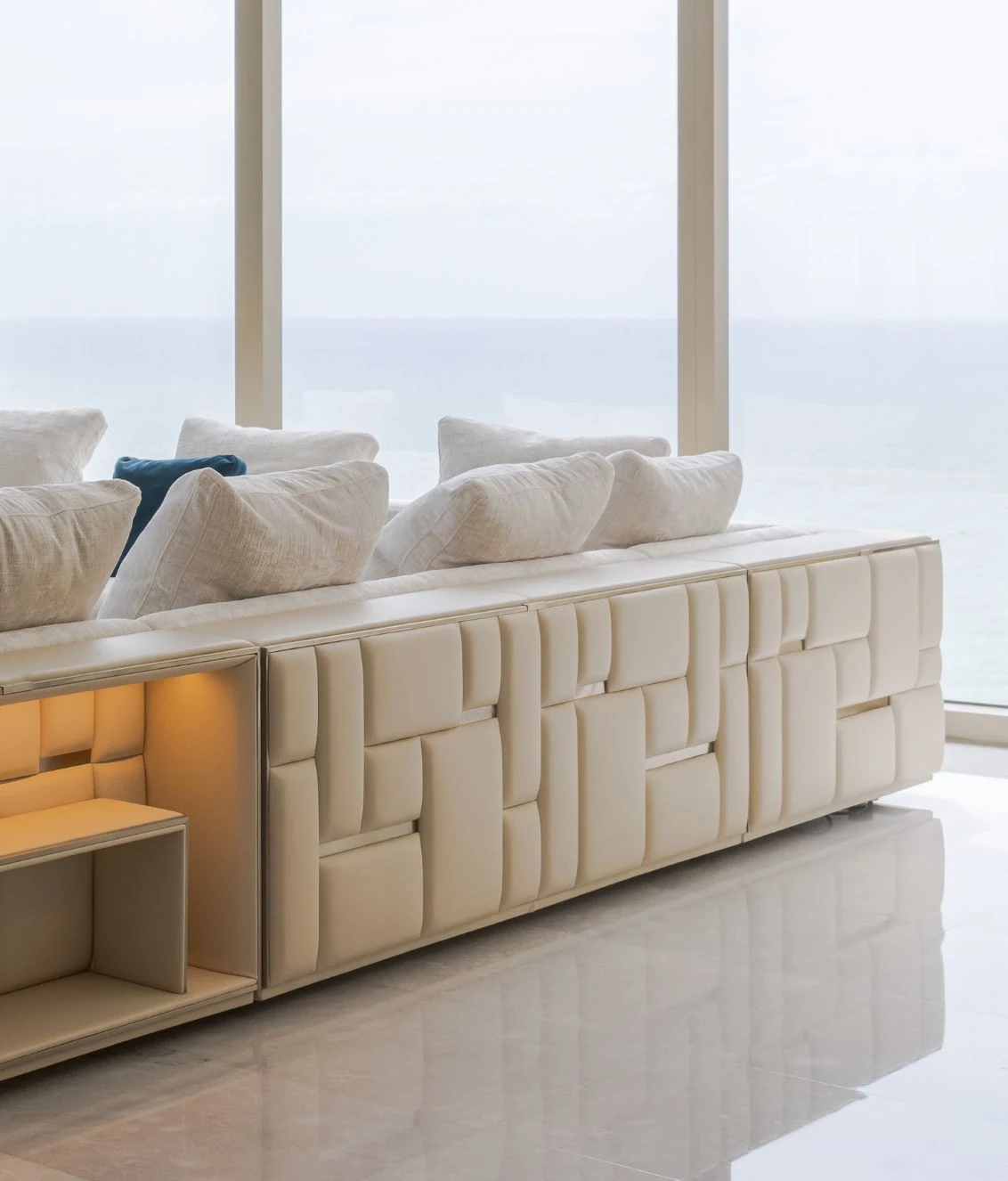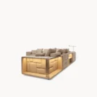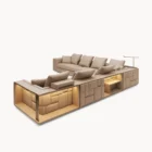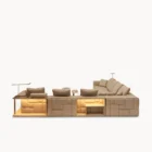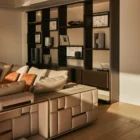 Opis: Modułową sofę Babylon Rack wyróżnia efektowne oparcie i podłokietniki, które tworzą abstrakcyjny motyw składający się z tapicerowanych paneli i satynowych stalowych wstawek z grawerowanym logo, dostępnych w wybranych wykończeniach. Wklęsłe bryły skrywają podświetlane diodami LED i przegródki na książki oraz akcesoria. Magnetyczne zagłówki i wbudowane ładowarki bezprzewodowe, zwiększają jej funkcjonalność. Poduszki siedziska wypełnione pianką Memory Foam® i pierzem dopełniają elegancki i komfortowy charakter sofy.