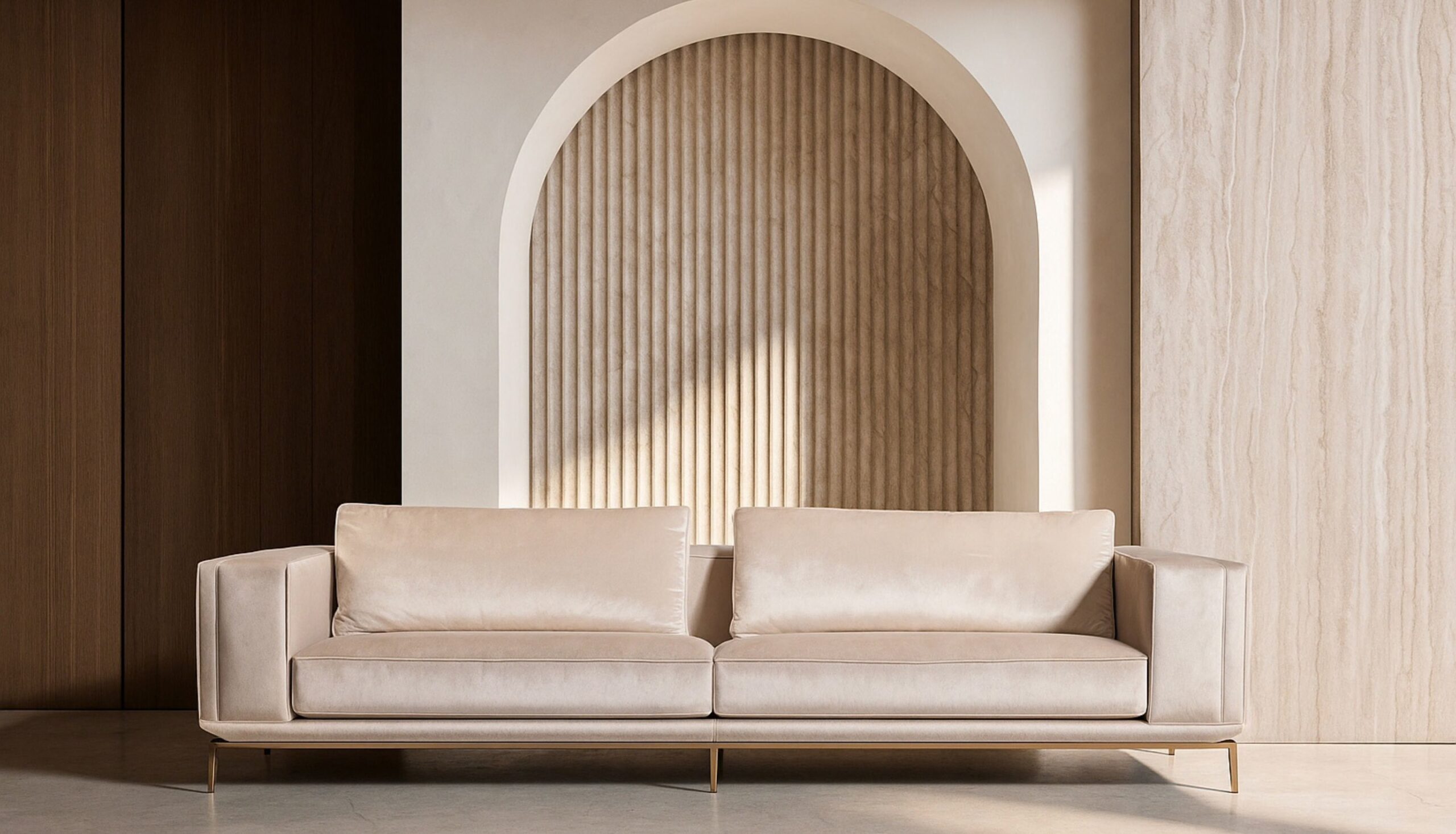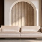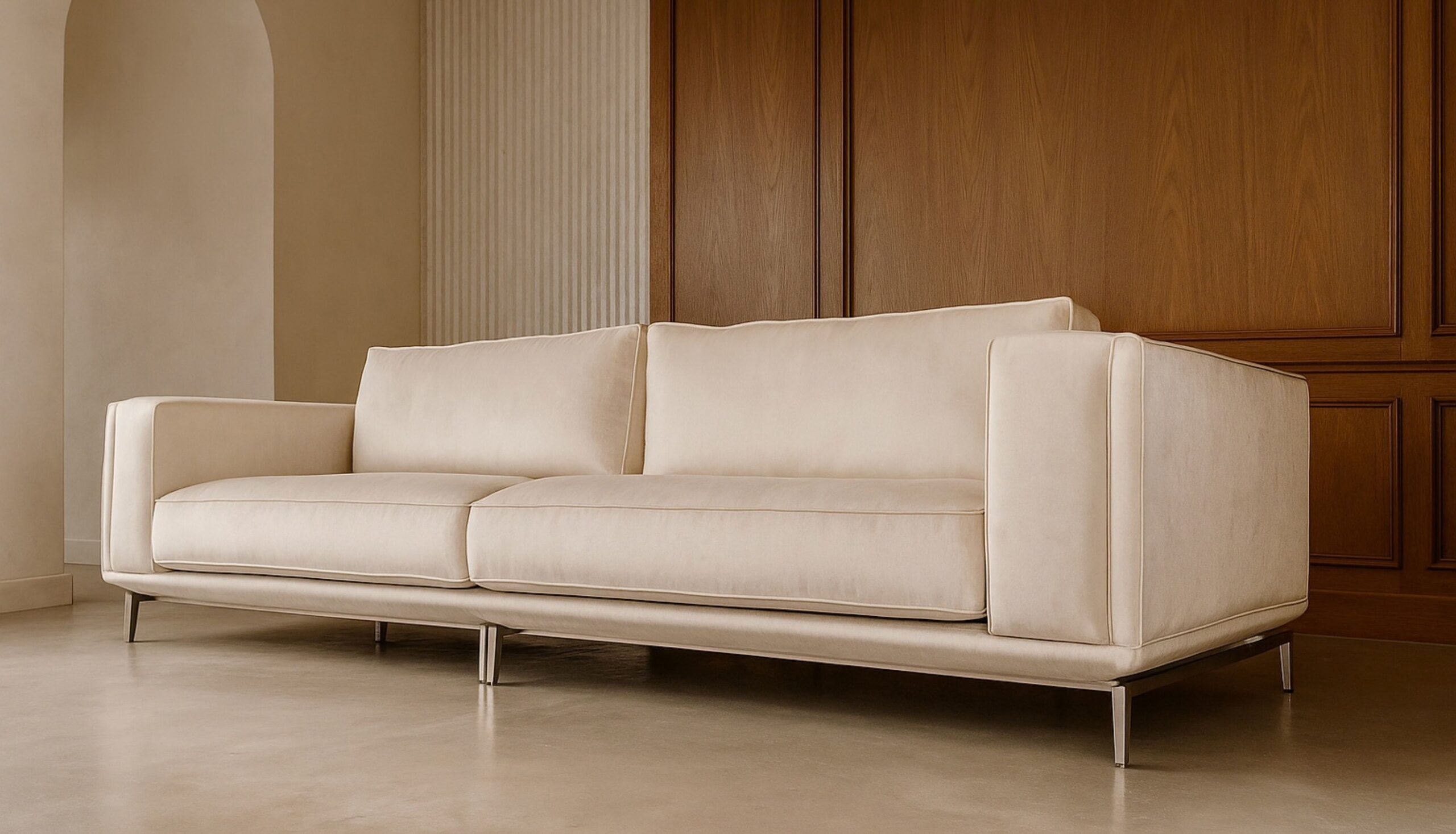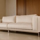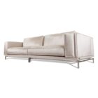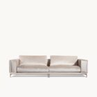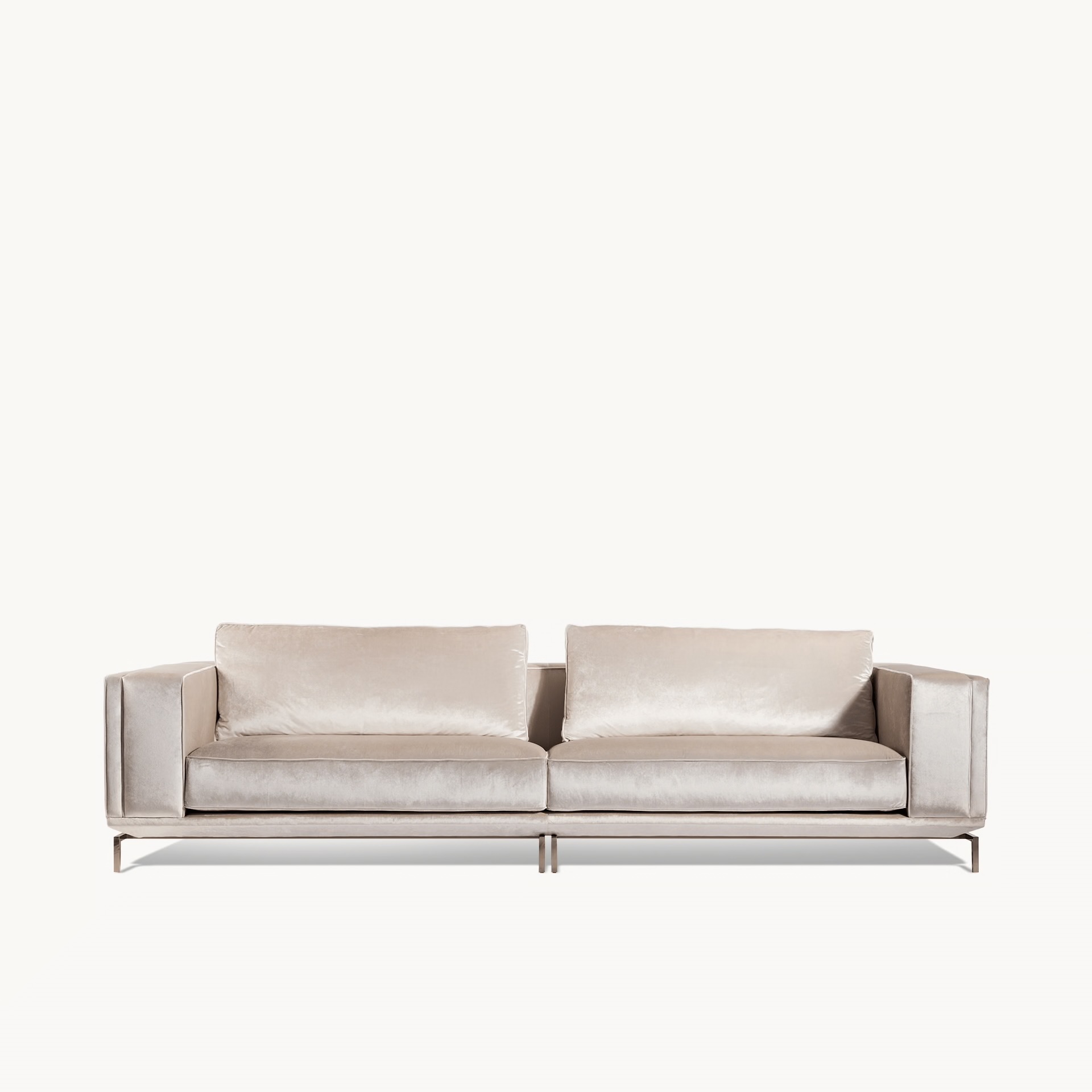 Opis: Sofa tapicerowana skórą lub tkaniną, z podstawą z satynowej stali nierdzewnej i panelem konstrukcyjnym z drewna i metalu, wyposażonym w elastyczne zawieszenie taśmowe. Wielowarstwowe, wyściełane podłokietniki i oparcia są wykończone lamówką, która podkreśla ich kształt. Siedzisko, wykonane z poliuretanu o zróżnicowanej gęstości, pianki Memory Foam® i puchu, uzupełnione jest o poduszki oparciowe z pierza, zapewniające miękkość i komfort.