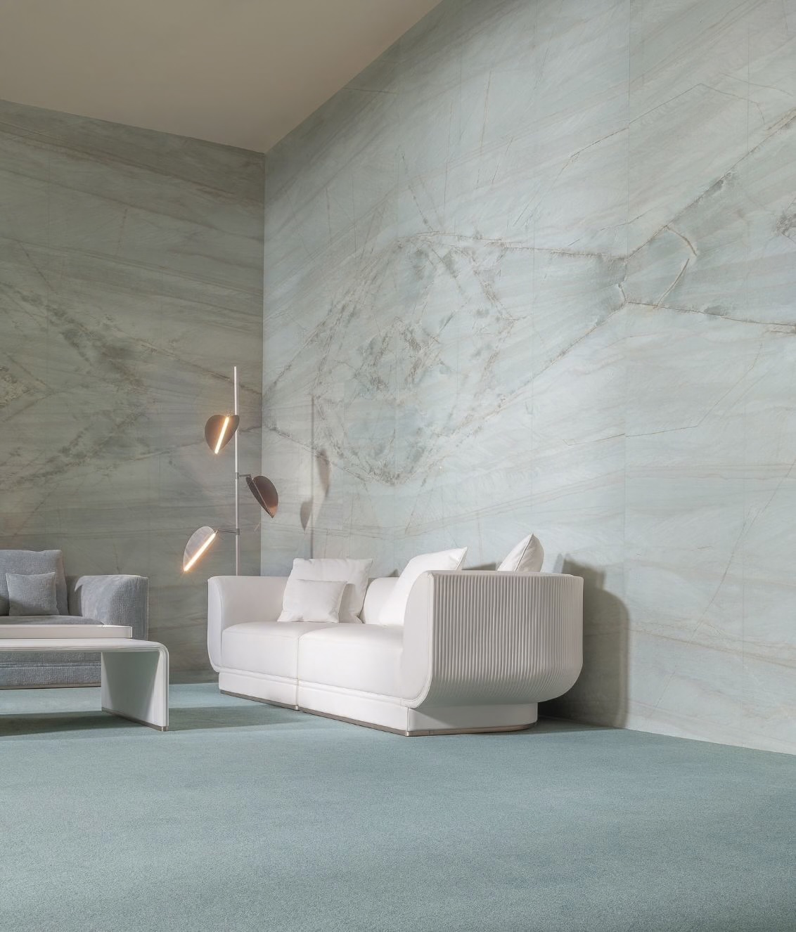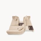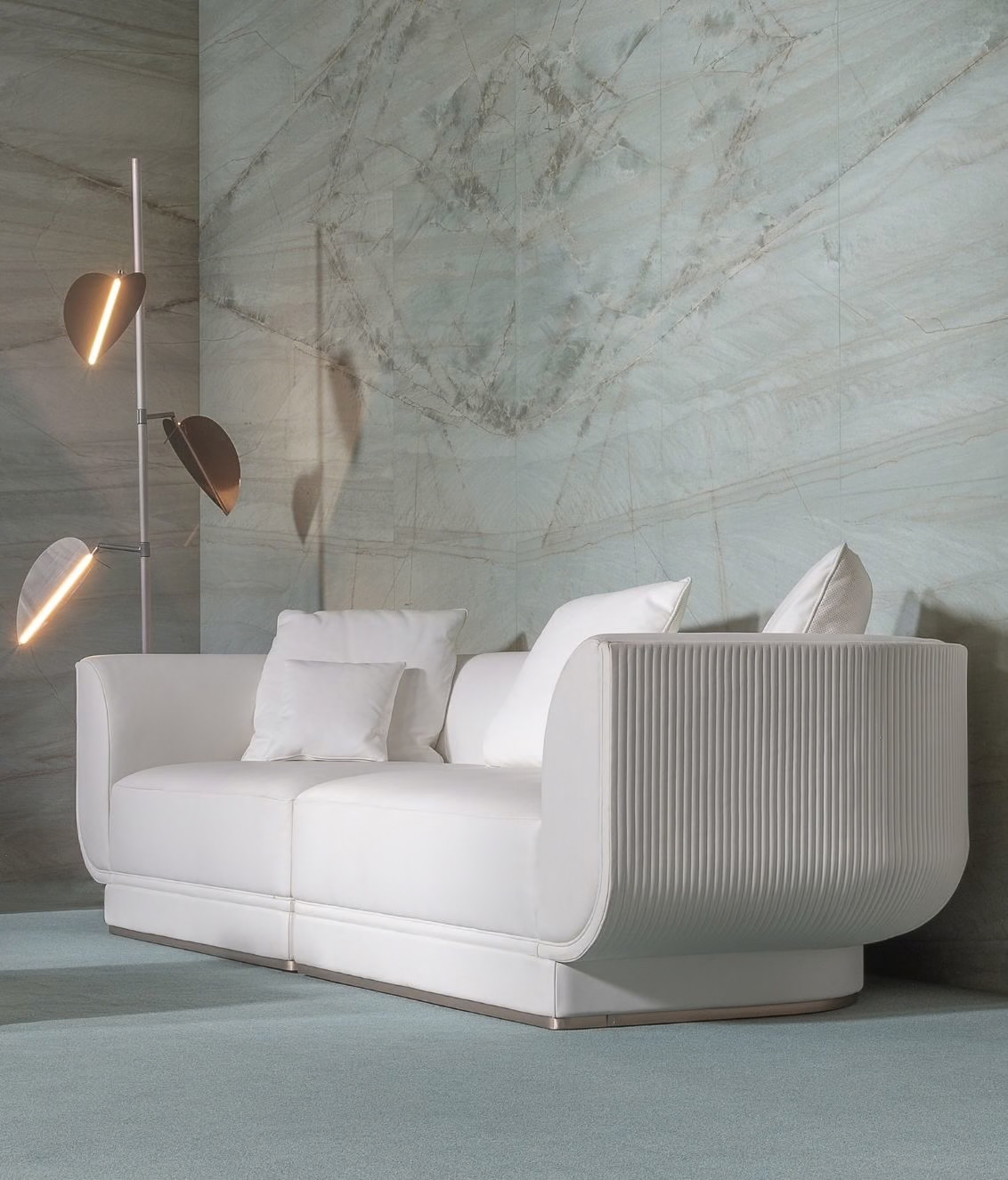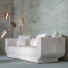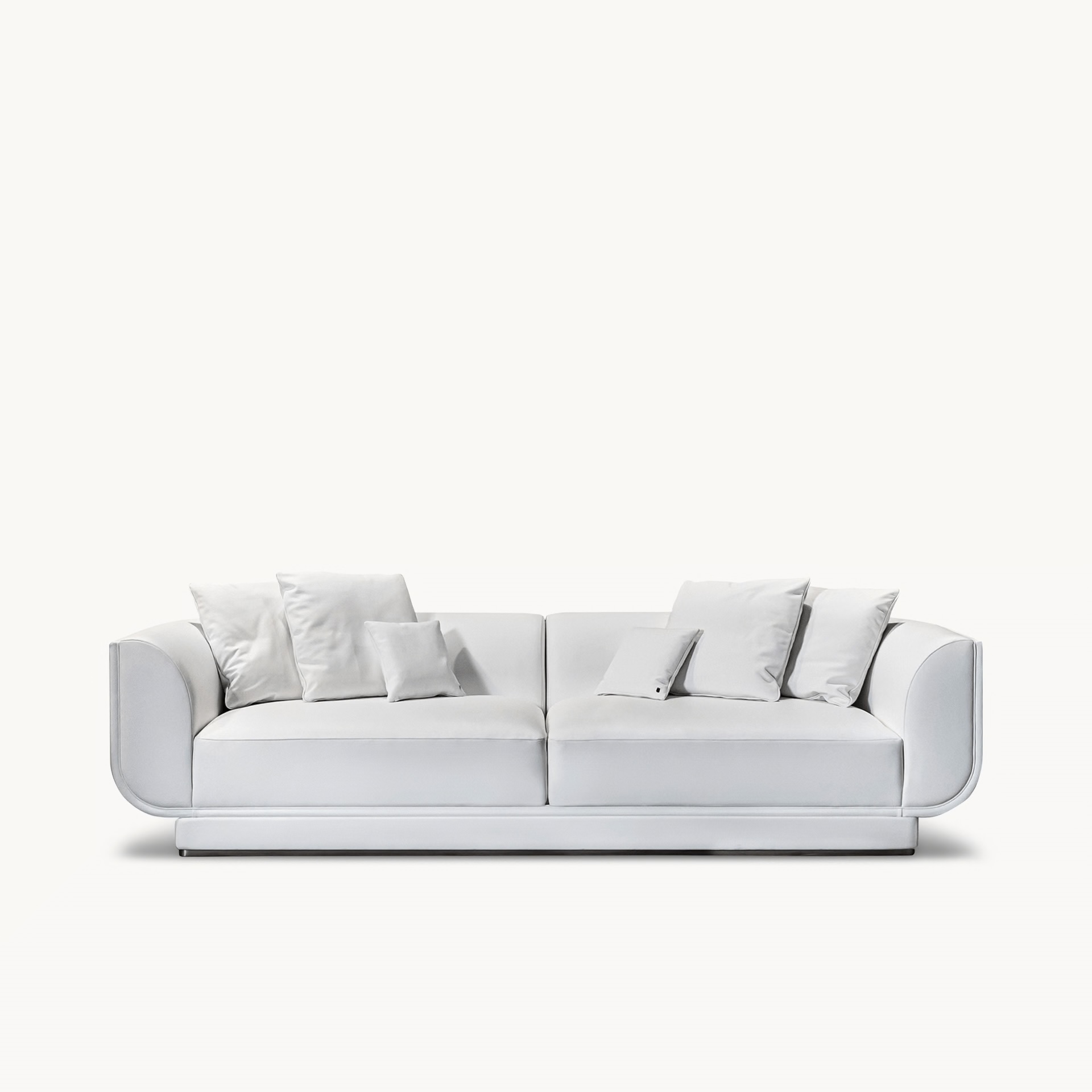 Opis: Sofa Foster jest tapicerowana skórą lub tkaniną, podstawa sofy opiera się na drewnianej ramie z elastycznym zawieszeniem. Zaokrąglone kształty bogato wyściełanych podłokietników i oparcia podkreślają poduszki wypełnione pierzem. Zewnętrzna tapicerka boków i oparcia jest ozdobiona pionowymi pikowaniami canneté, które nadają powierzchni wyrafinowaną fakturę. Metalowy cokół, dostępny w dowolnym wykończeniu metalu jest dodatkowym ekskluzywnym akcentem.