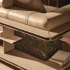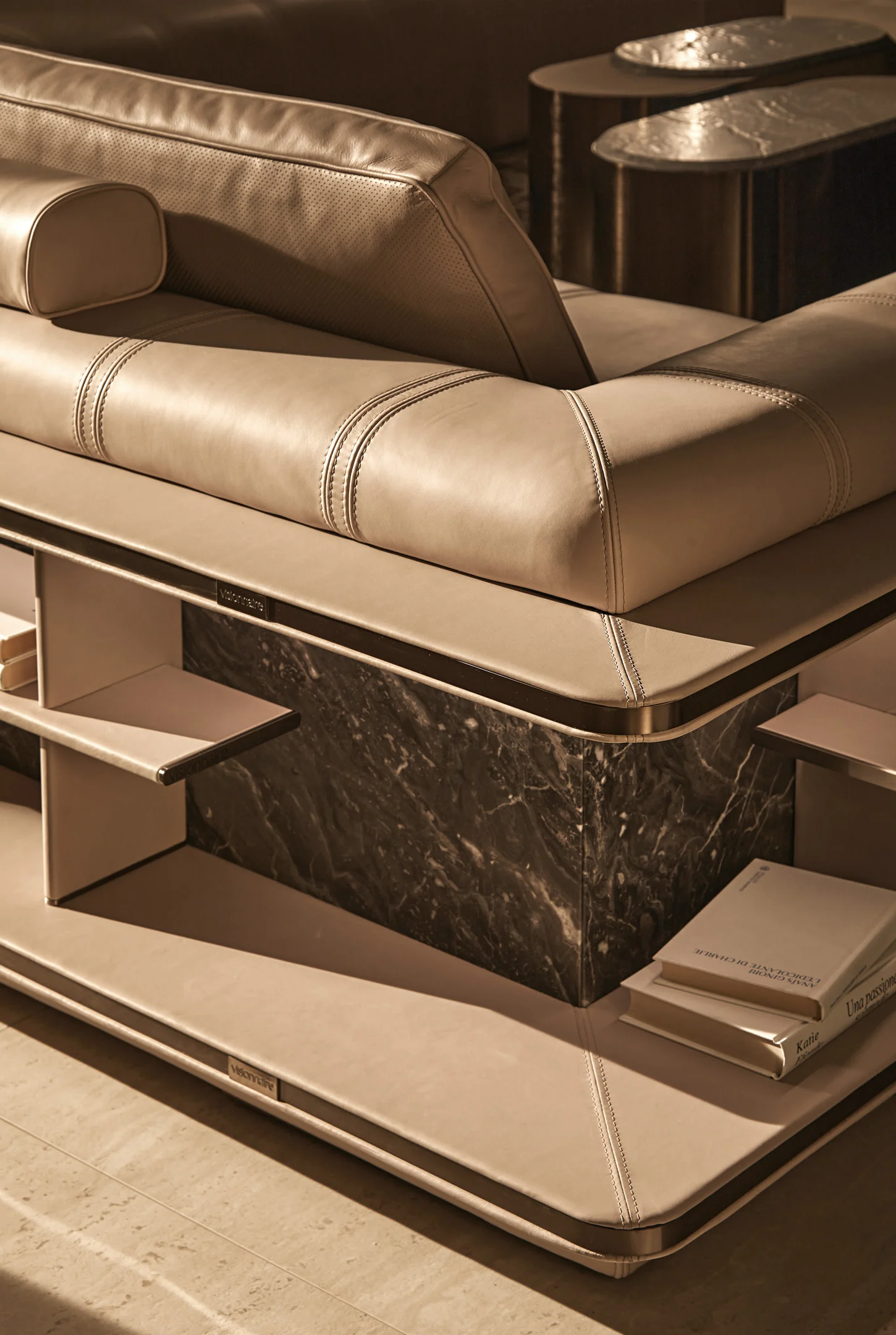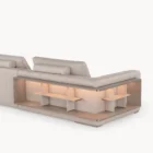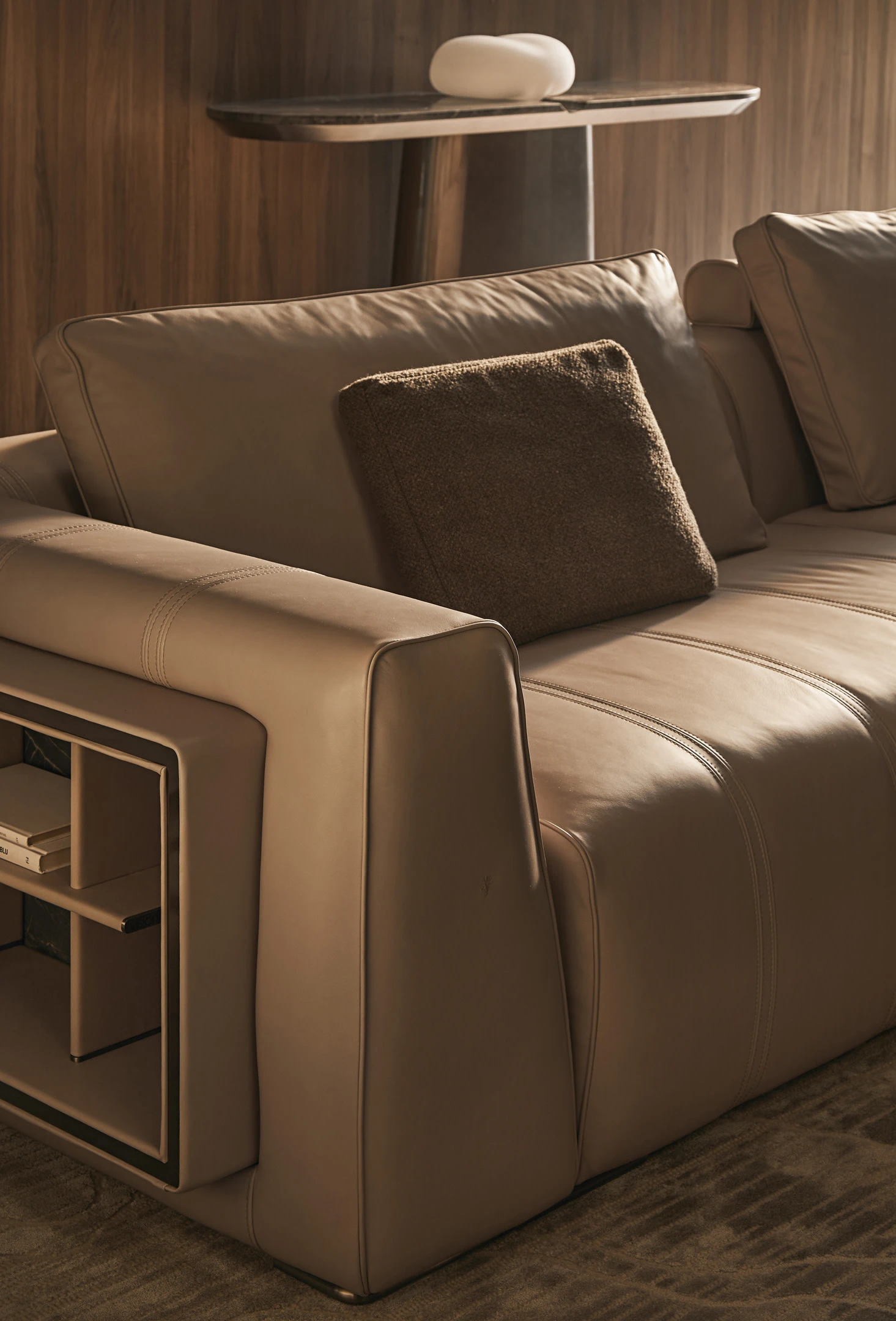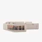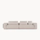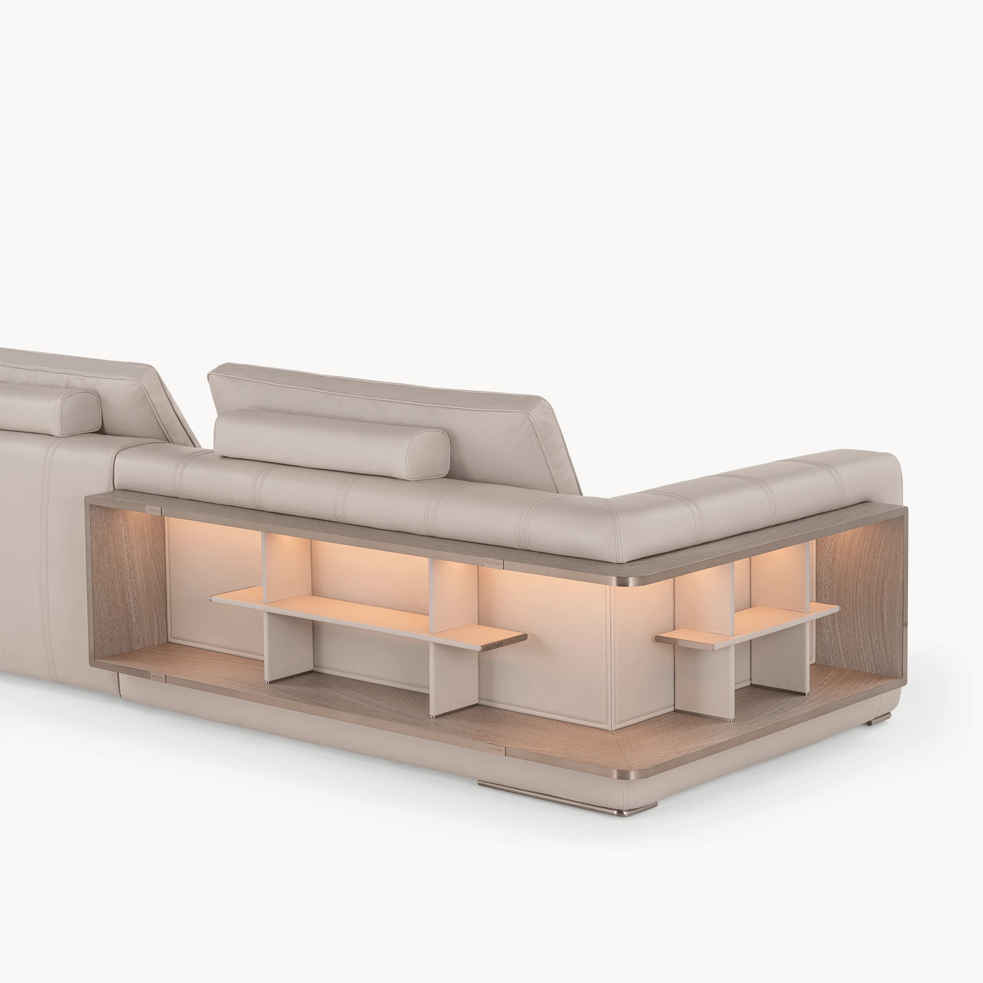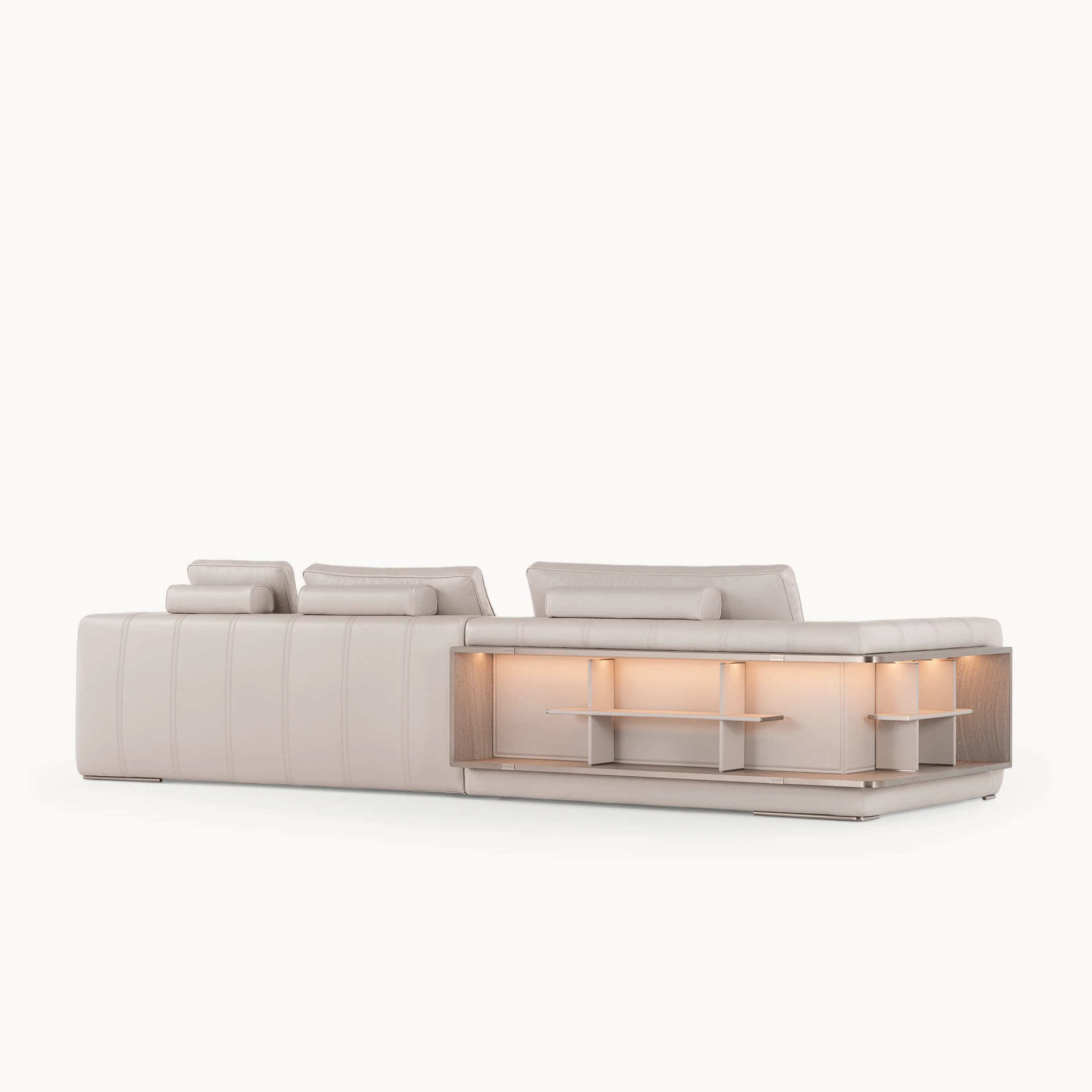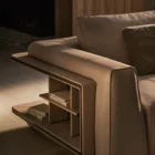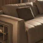 Opis: Sofa Loving Frank jest dostępna w wersji liniowej lub modułowej. Rama z litego drewna jest podparciem wygodnego siedziska miękko wyściełanego, ozdobionego podwójnymi przeszyciami. Poduszki oparcia wykonane z gęsiego puchu dla lepszego komfortu siedzenia zostały uzupełnione o magnetyczne zagłówki. Opcjonalne elementy boczne mogą zawierać regały na książki z oświetleniem LED, dostępne ze skórzanymi panelami tylnymi i drewnianymi półkami lub z marmurowym panelem tylnym i półkami obitymi skórą. Regał uzupełniają satynowane profile ze stali nierdzewnej.