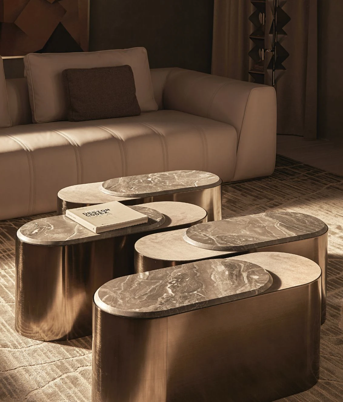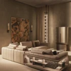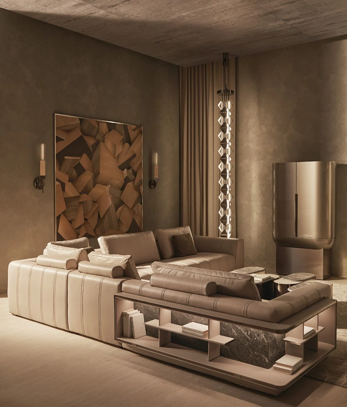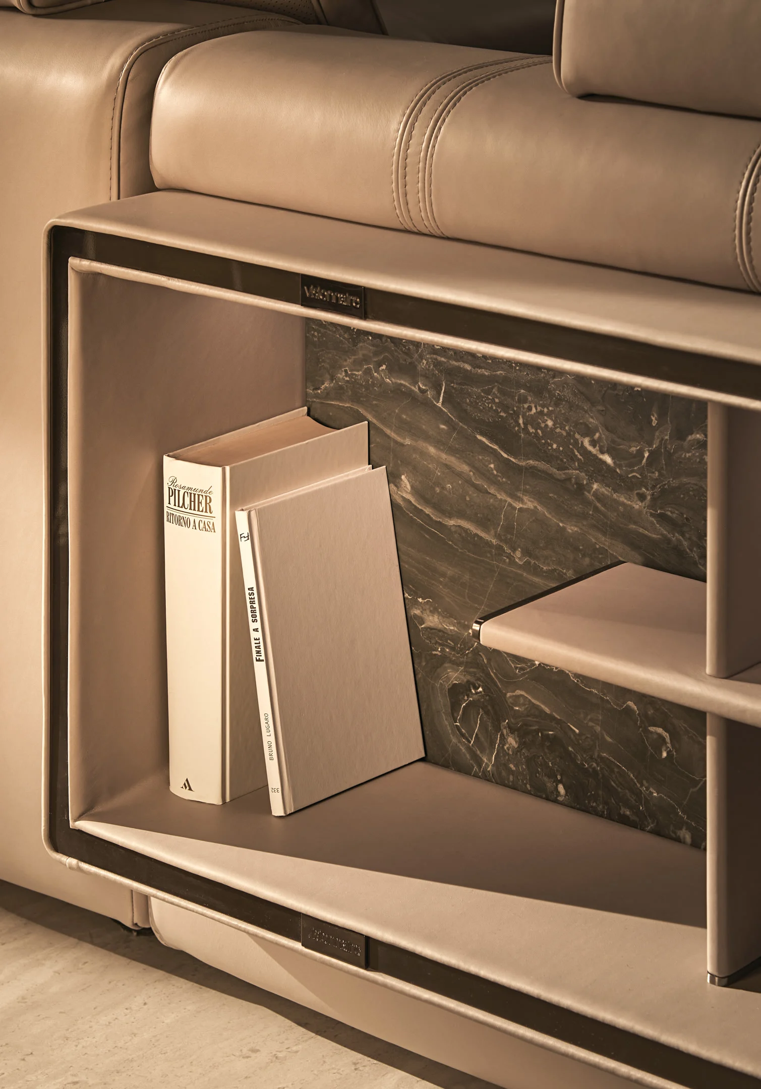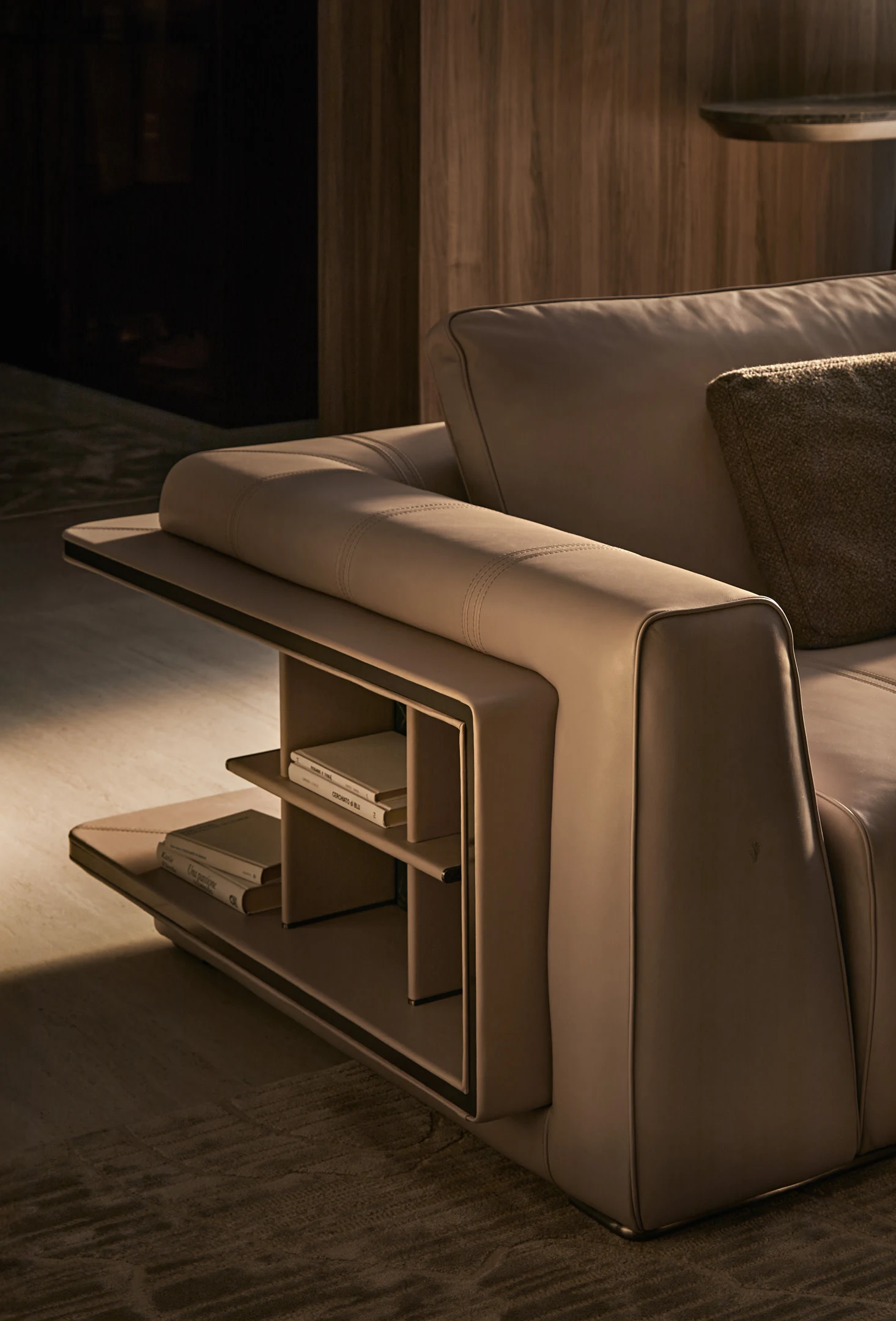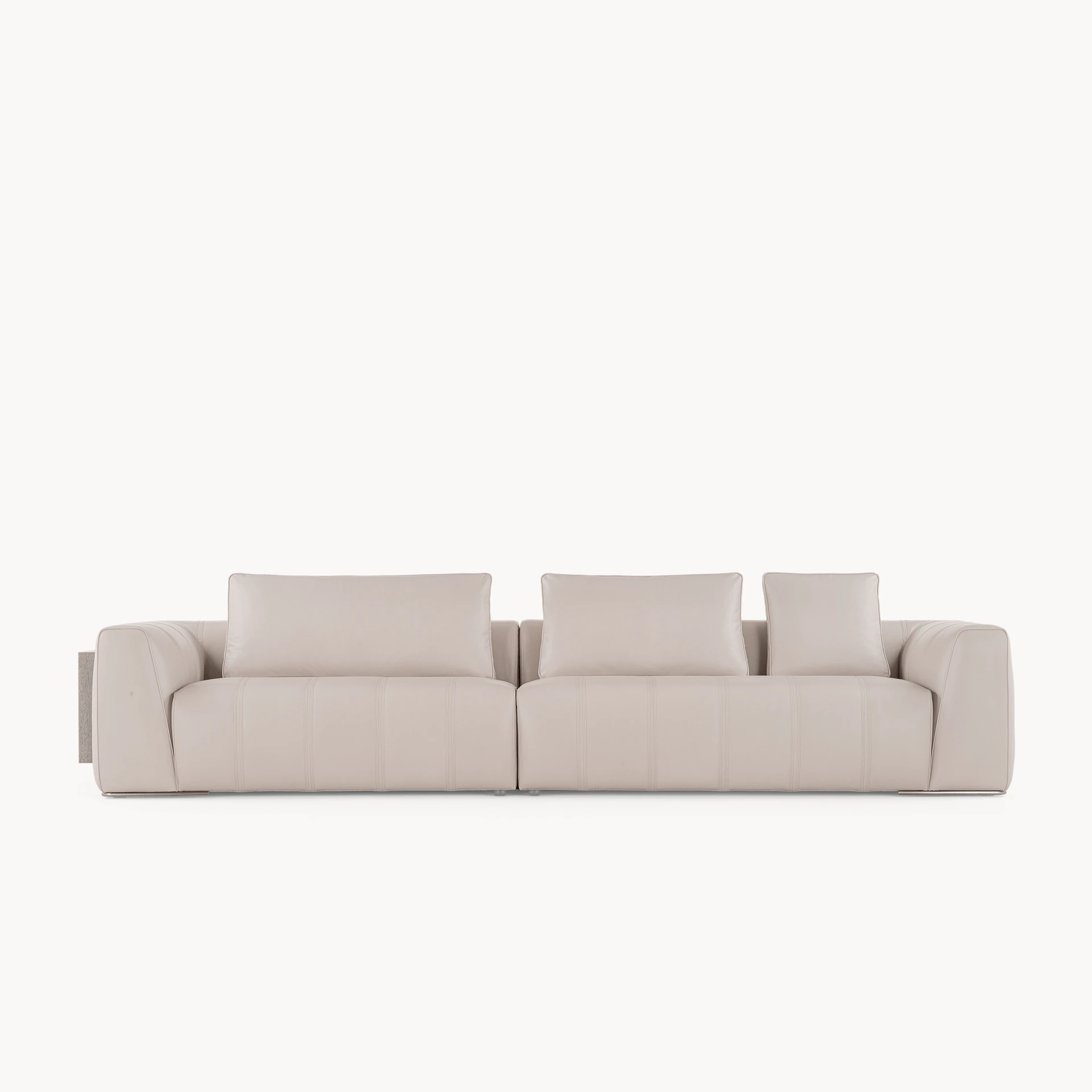 Opis: Sofa Loving Frank jest dostępna w wersji liniowej lub modułowej. Rama z litego drewna jest podparciem wygodnego siedziska miękko wyściełanego, ozdobionego podwójnymi przeszyciami. Poduszki oparcia wykonane z gęsiego puchu dla lepszego komfortu siedzenia zostały uzupełnione o magnetyczne zagłówki. Opcjonalne elementy boczne mogą zawierać regały na książki z oświetleniem LED, dostępne ze skórzanymi panelami tylnymi i drewnianymi półkami lub z marmurowym panelem tylnym i półkami obitymi skórą. Regał uzupełniają satynowane profile ze stali nierdzewnej.