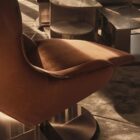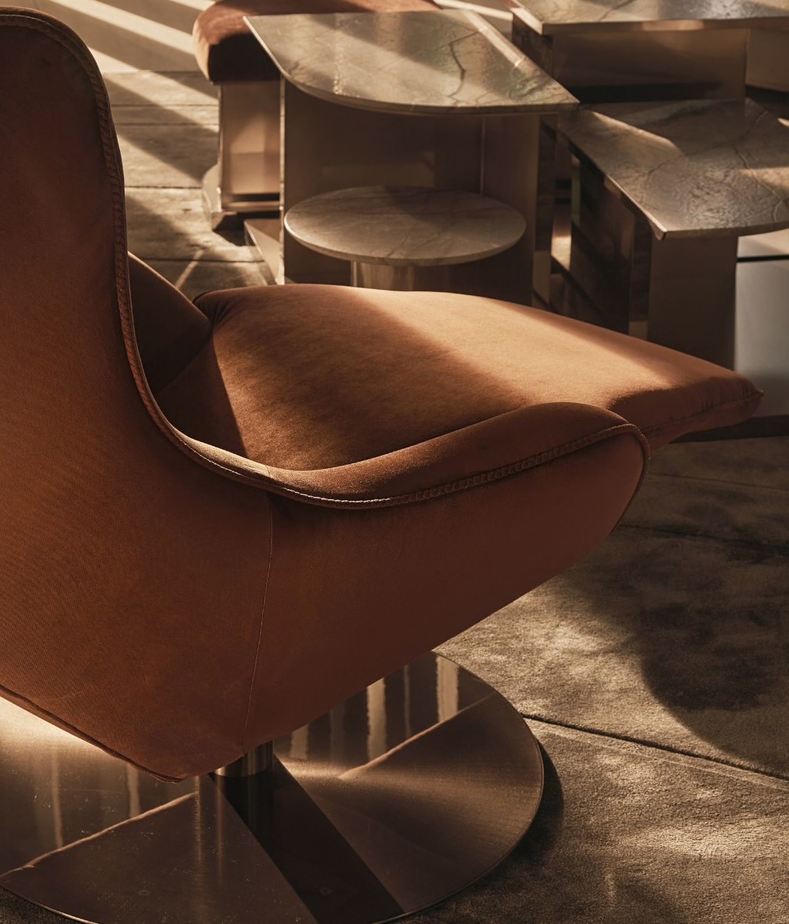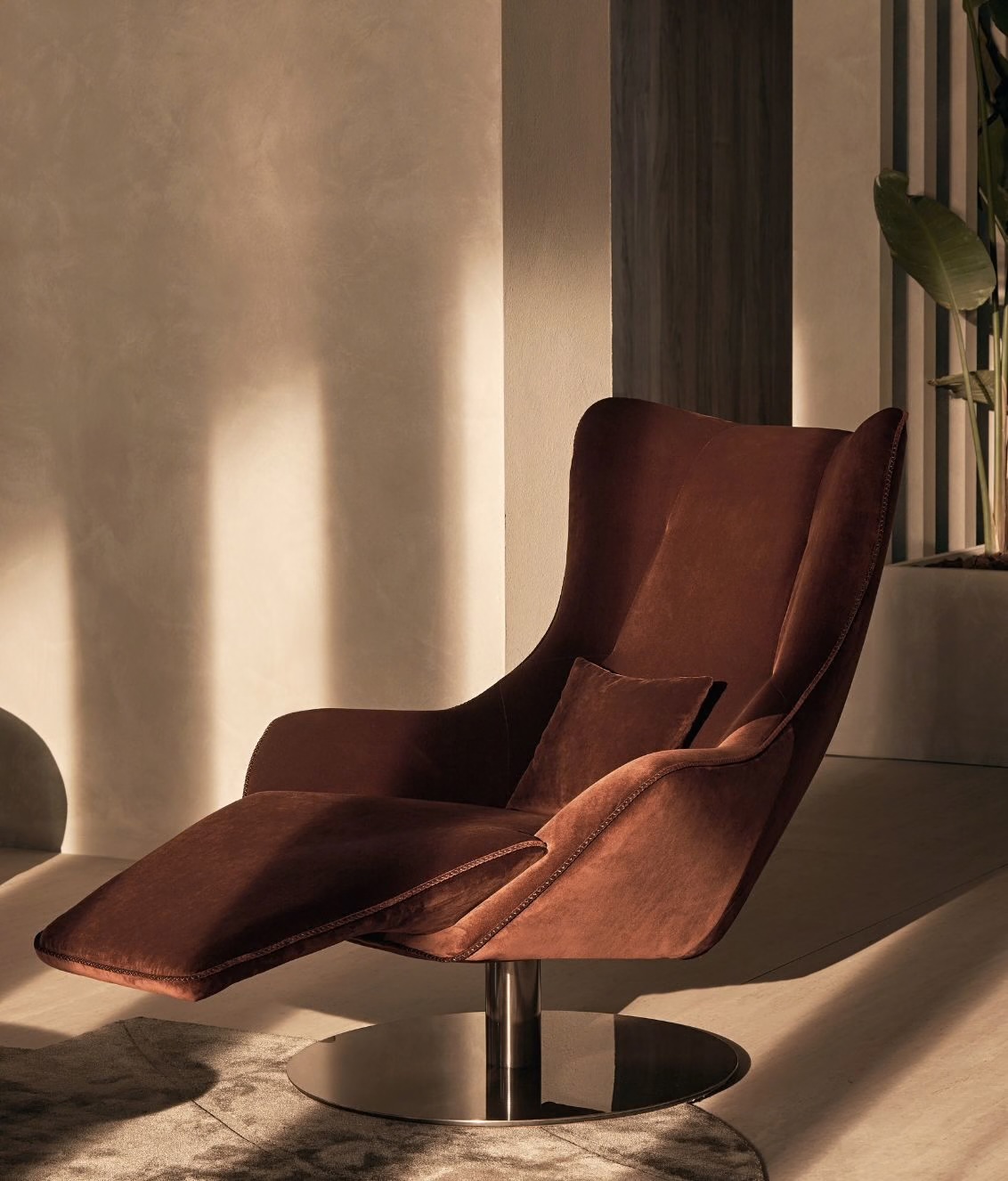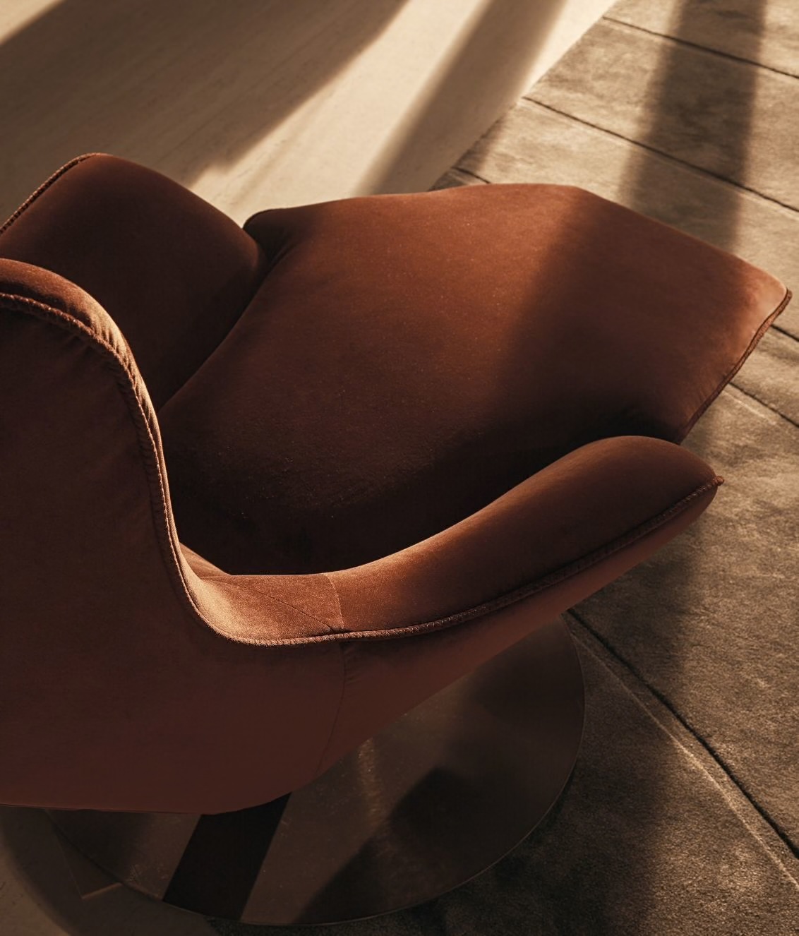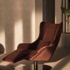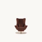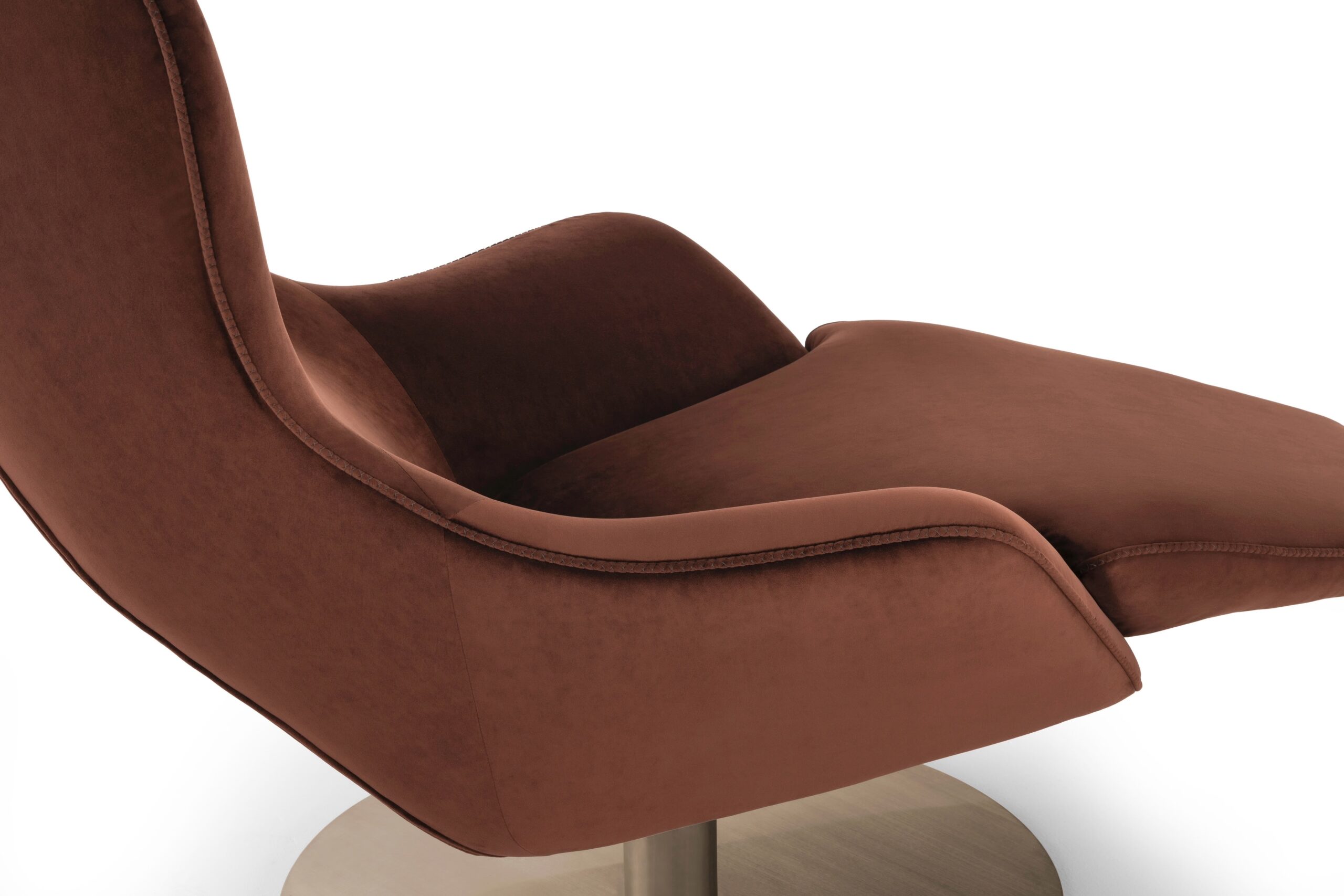 Opis: Szezlong o falistym profilu, z formowaną klejoną ramą i warstwową wyściółką z poliuretanu oraz włókna akrylowego dla zapewnienia wyjątkowego komfortu. Tapicerka skórzana lub materiałowa idealnie dopasowuje się do miękkich krzywizn siedziska. Całość dopełnia obrotowa stalowa podstawa, dostępna w metalowym wykończeniu ręcznie satynowanym.
