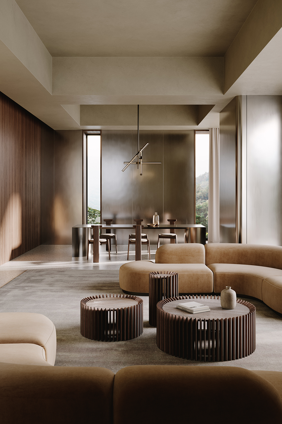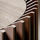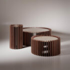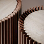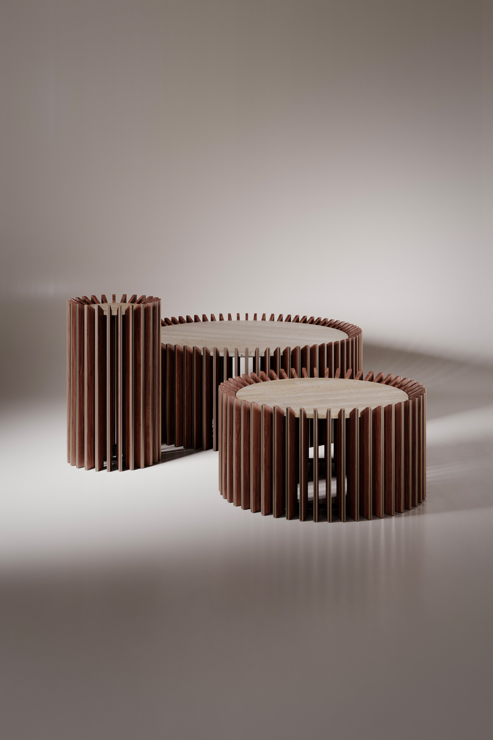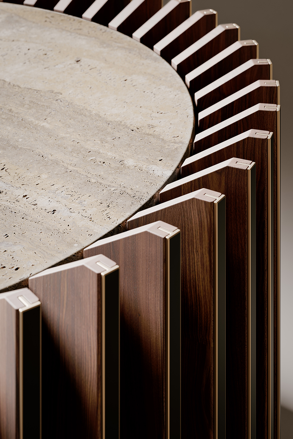 Opis: Stolik kawowy Blade Special Edition charakteryzuje się współgraniem brył, pustych przestrzeni i odblaskowych akcentów. Listwy z drewna orzechowego, ułożone promieniście, posiadają wstawki w kształcie litery T z polerowanego mosiądzu, które nadają materiałowi rytm. Blat z trawertynu spoczywa na konstrukcji, tworząc świetlistą i przyjemną w dotyku powierzchnię. Stolik kawowy Blade jest dostępny w wersji stołowej oraz w innym modelu stolika kawowego.