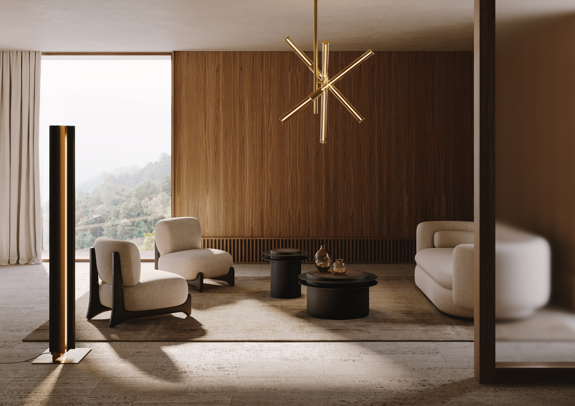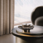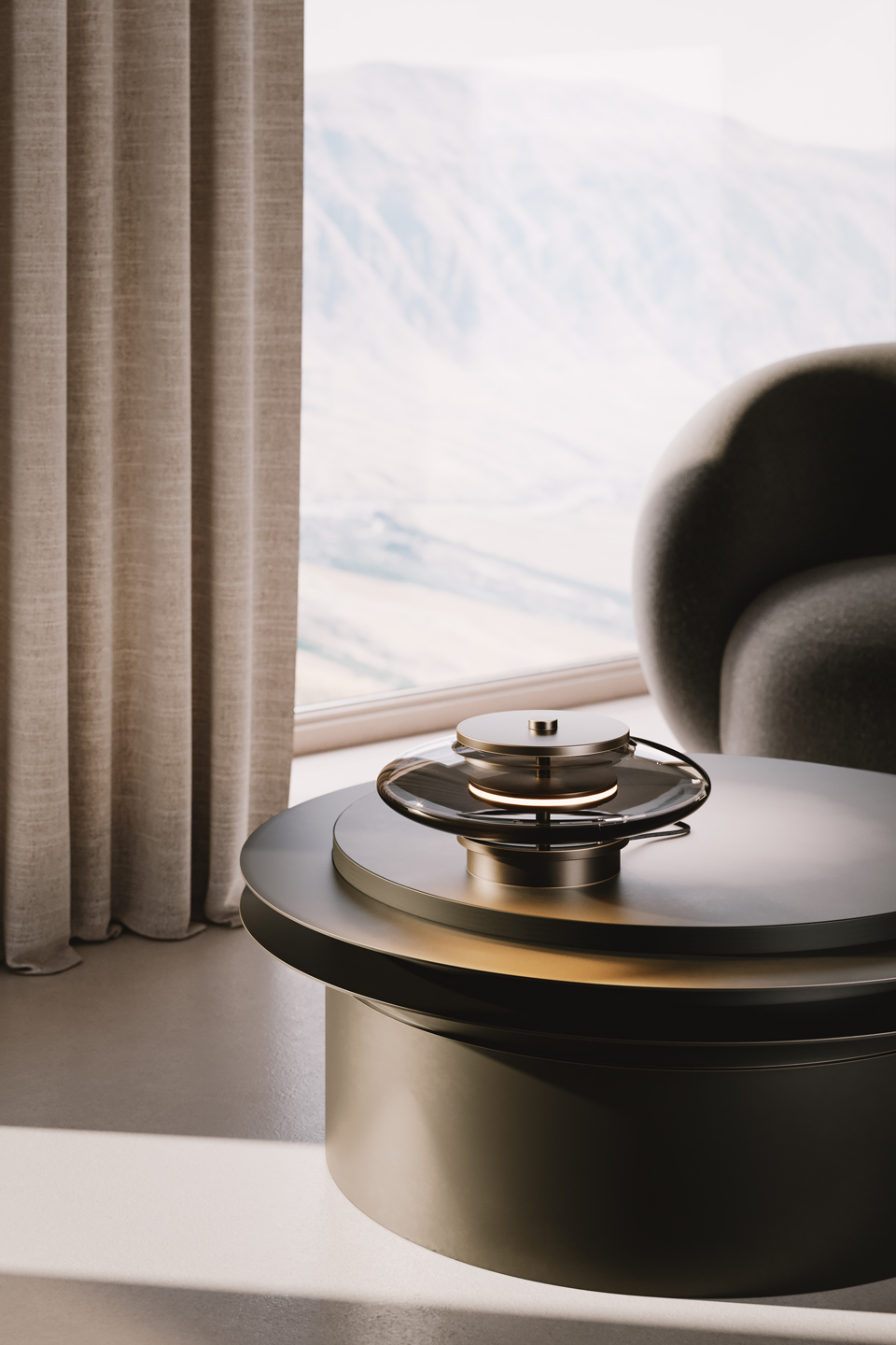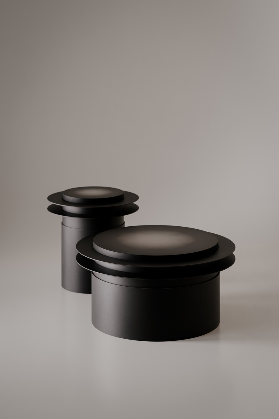 Opis: Elementy o niejednorodnej bryle ewoluują w zwarte kompozycje. Solidna, centralna bryła stolika kawowego Ring, przecięta dwiema koncentrycznymi, wystającymi płaszczyznami, podkreśla namacalność materiału, z którego został wykonany. Kunszt wykonania stopionego, polerowanego metalu ożywia niuanse i nieregularności, które dodają nieprzewidywalności geometrycznej precyzji jego kształtów i materiałów. Stolik kawowy Ring jest dostępny w dwóch rozmiarach.