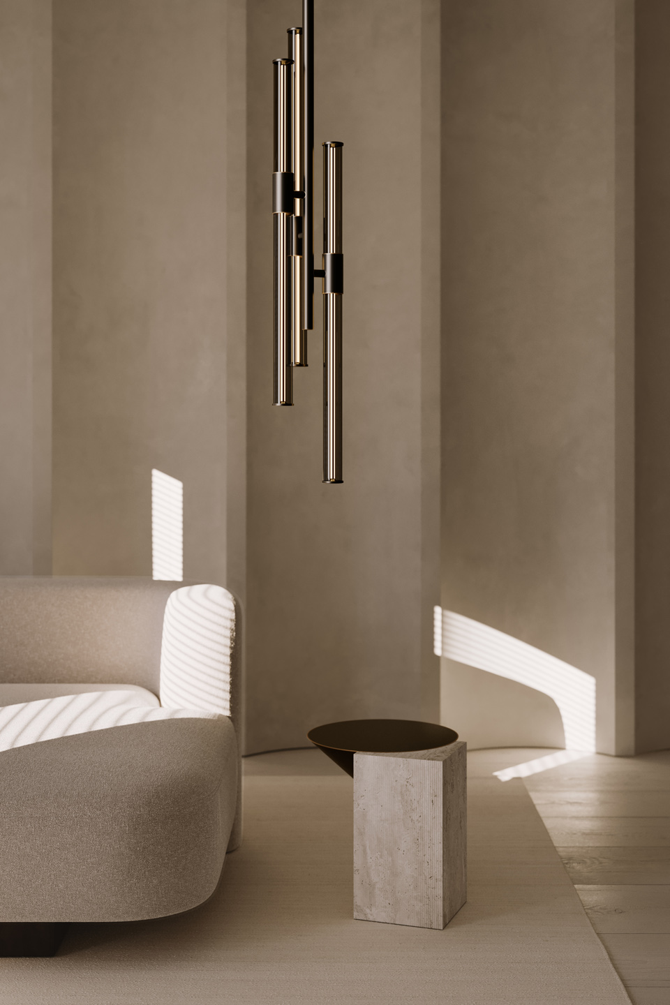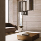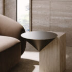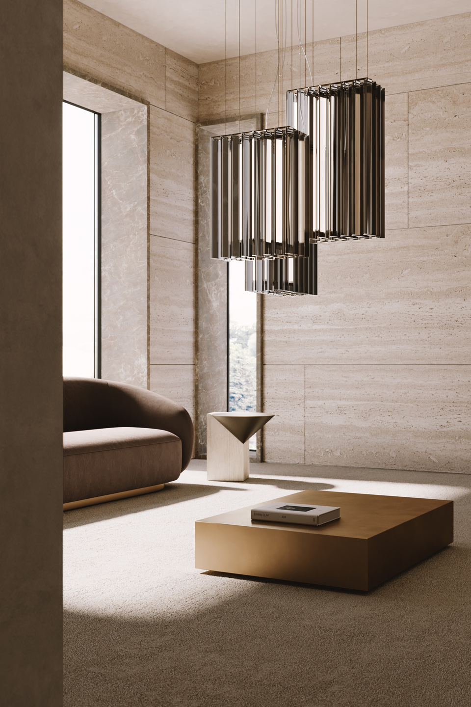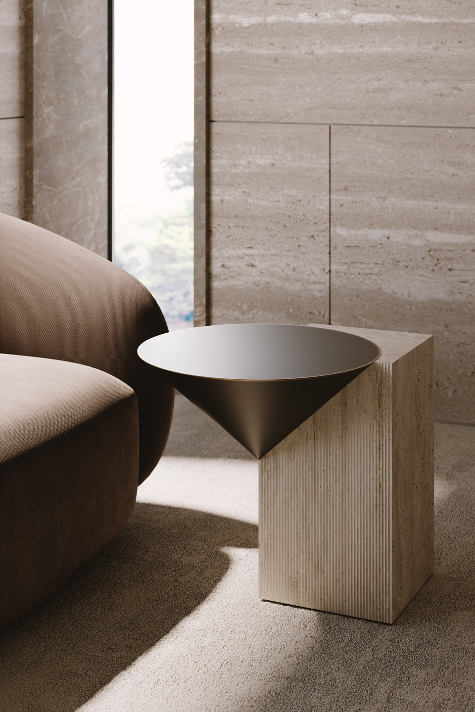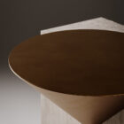 Opis: Kamień i metal, rzeźbione i kształtowane przez mistrzowskie ręce, tworzą estetykę, której korzenie tkwią w kontraście między formą a materią. Stolik kawowy Rock składa się z odwróconego, stożkowego blatu z mosiądzu, osadzonego w bloku trawertynu o otwartych porach. Dwa elementy i połączenie proporcji i równowagi, zostały przekształcone w stolik o asymetrycznej konstrukcji.