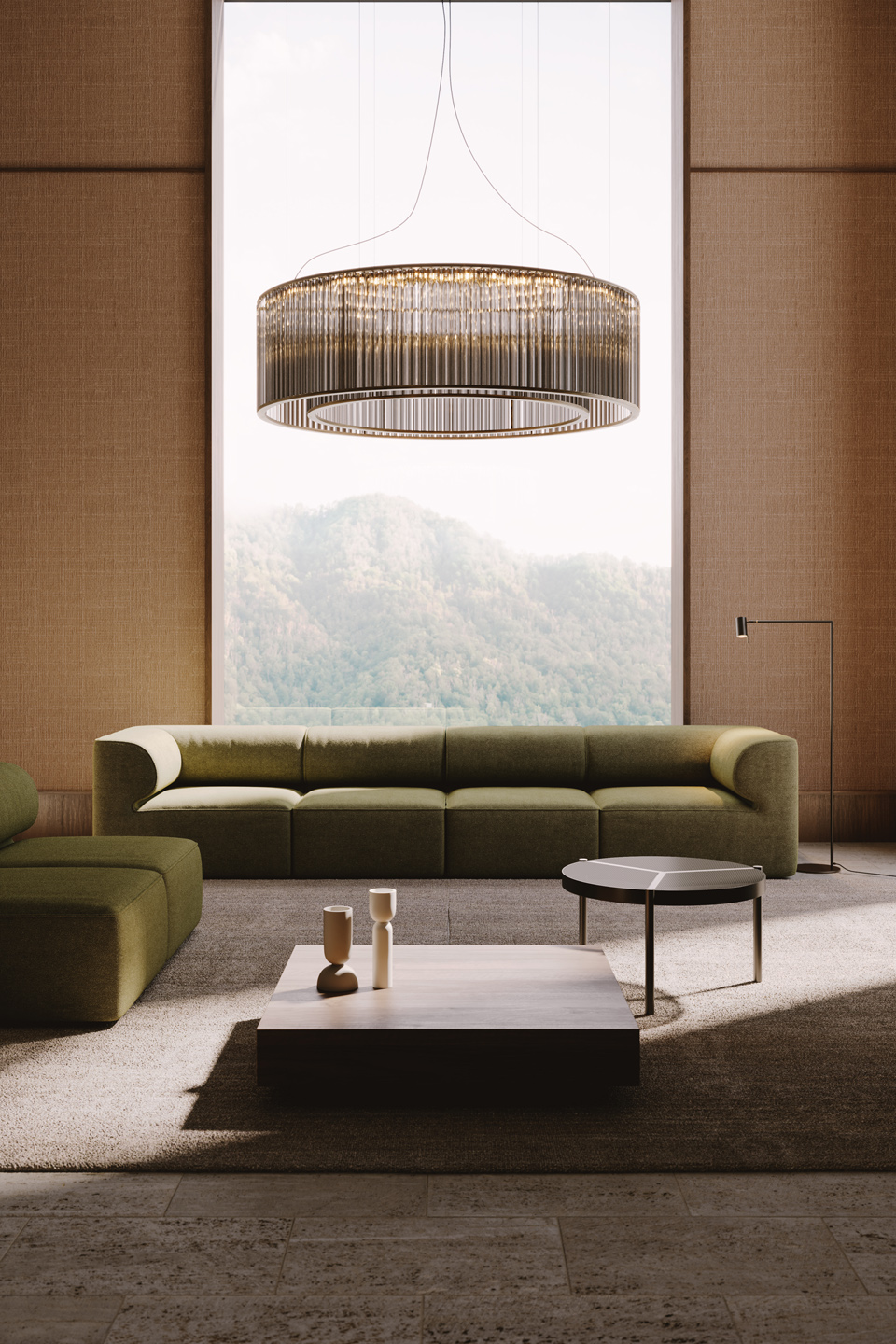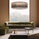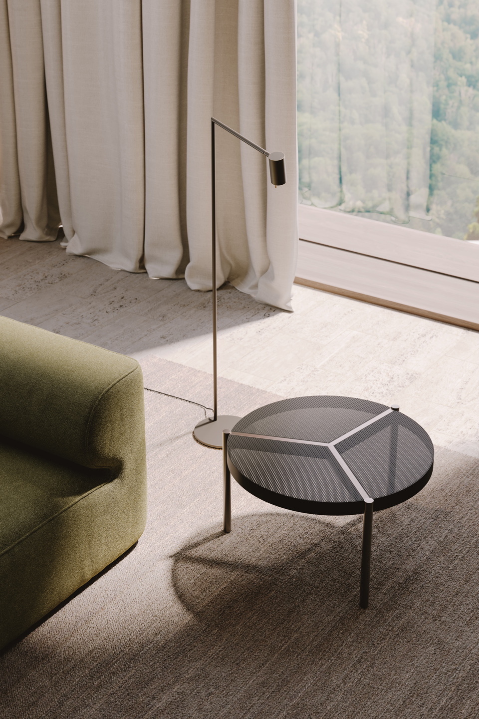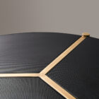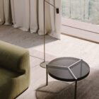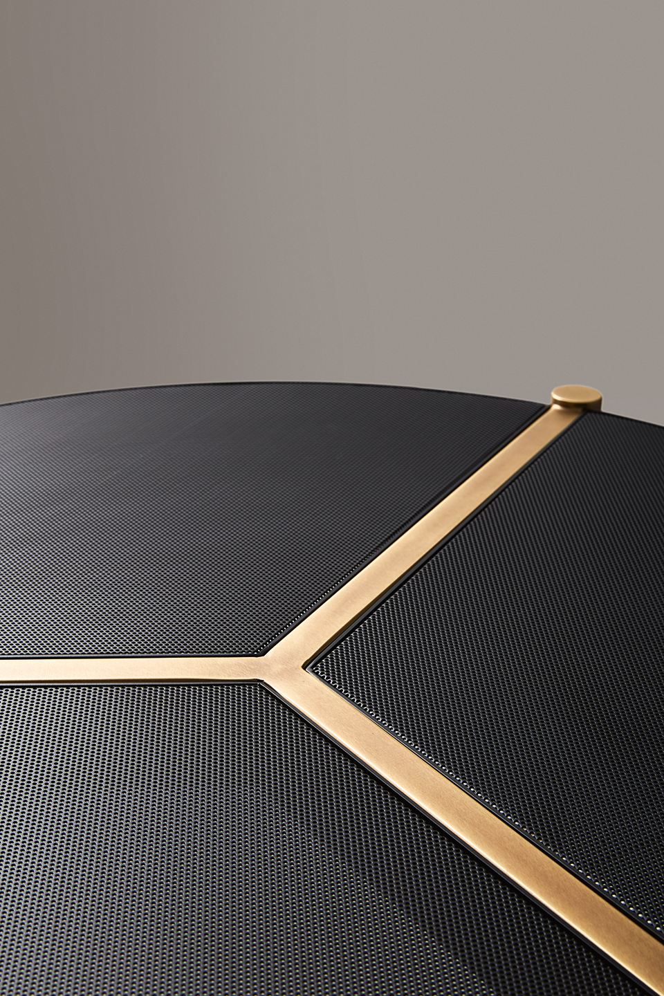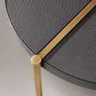 Opis: Perforowany metal w blacie podkreśla kontury delikatnej struktury, pozwalając naturalnemu światłu przesączać się przez mikrootwory tworząc wzory światła na otaczających powierzchniach. Trzy jasnobrązowe poprzeczki stolika kawowego Urban dzielą blat na jednorodne trójkąty i kończą się solidnymi nogami. Miękkie i proste profile podkreślają esencję materiałów.