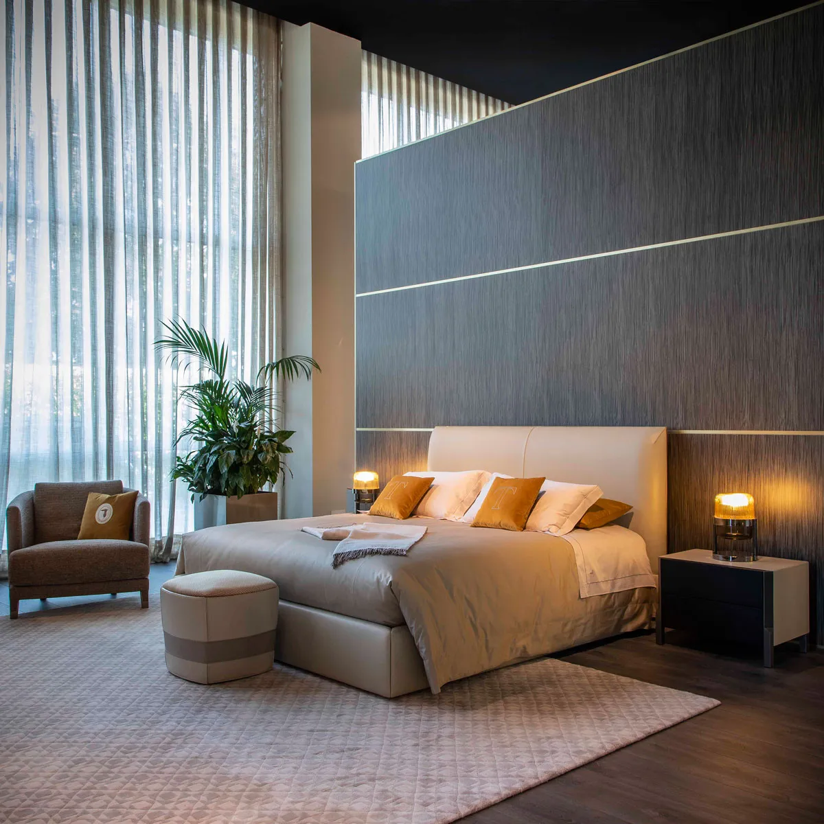 Opis: Szafka nocna Band jest częścią funkcjonalnej rodziny mebli. Urzeka nas prostym lecz wyrafinowanym designem, gdzie jedyny ozdobny element to charakterystyczny metalowy detal ścięty pod kątem 45°, który wznosi się od dołu do góry. Ten wyjątkowy mebel może być tapicerowany skórą wykończoną ozdobnymi przeszyciami na krawędziach. Jego ponadczasowa elegancja sprawia, że jest on funkcjonalnym dodatkiem do każdej nowoczesnej sypialni.